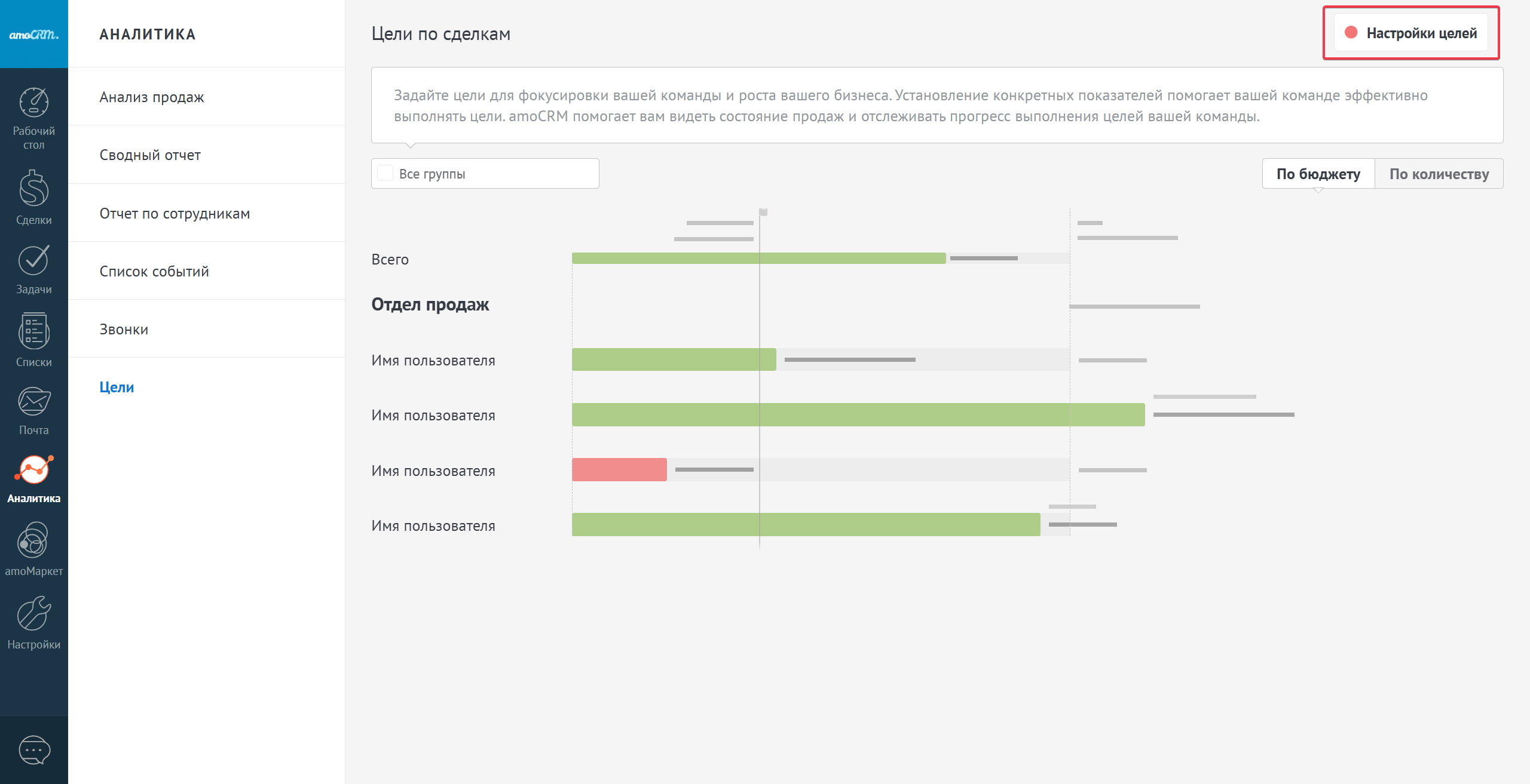 Нажмите кнопку "Сохранить" в правом верхнем углу экрана. Цель будет достигаться сделками, перешедшими в этап "Успешно и реализовано". Если прогресс по цели будет выполнен к отчетной границе настроенного периода (вертикальная полоска с флажком, зависящая от текущей даты), или цель по менеджеру будет выполнена или перевыполнена, то его цель будет окрашена в зеленый цвет. Если цель не начала выполняться, то есть бюджет и количество составляют 0, или цель начала выполняться, но бюджет и количество не доходят к отчетной границе, то цель по менеджеру будет окрашена в красный цвет.