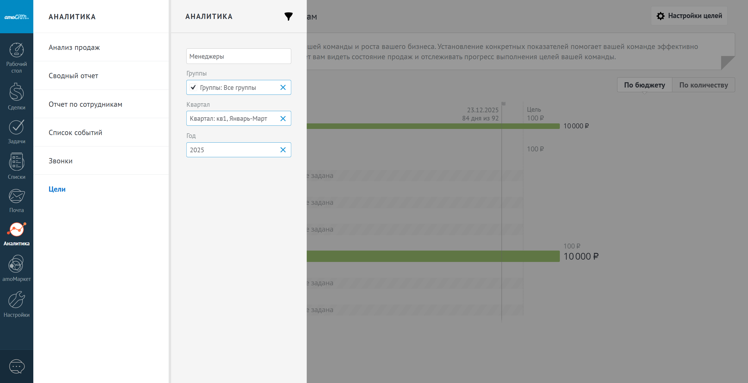 Фильтр в разделе "Цели" работает по следующим параметрам:
