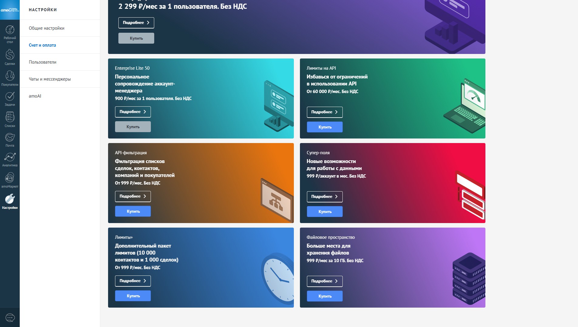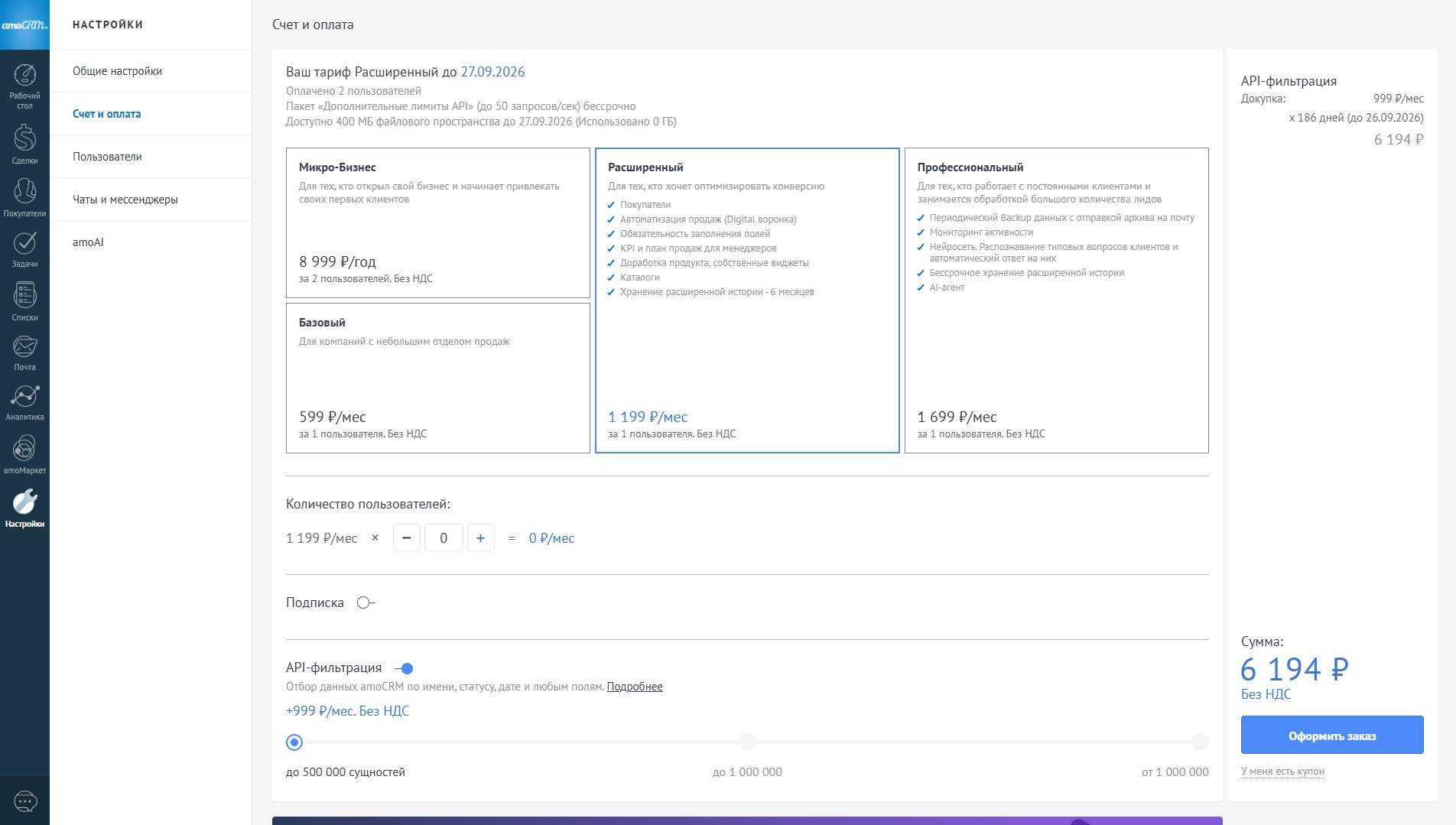 Чтобы докупить пакет “API-Фильтрация”, необходимо перейти в раздел “Настройки” на левой панели, нажать на подраздел “Счет и оплата”.