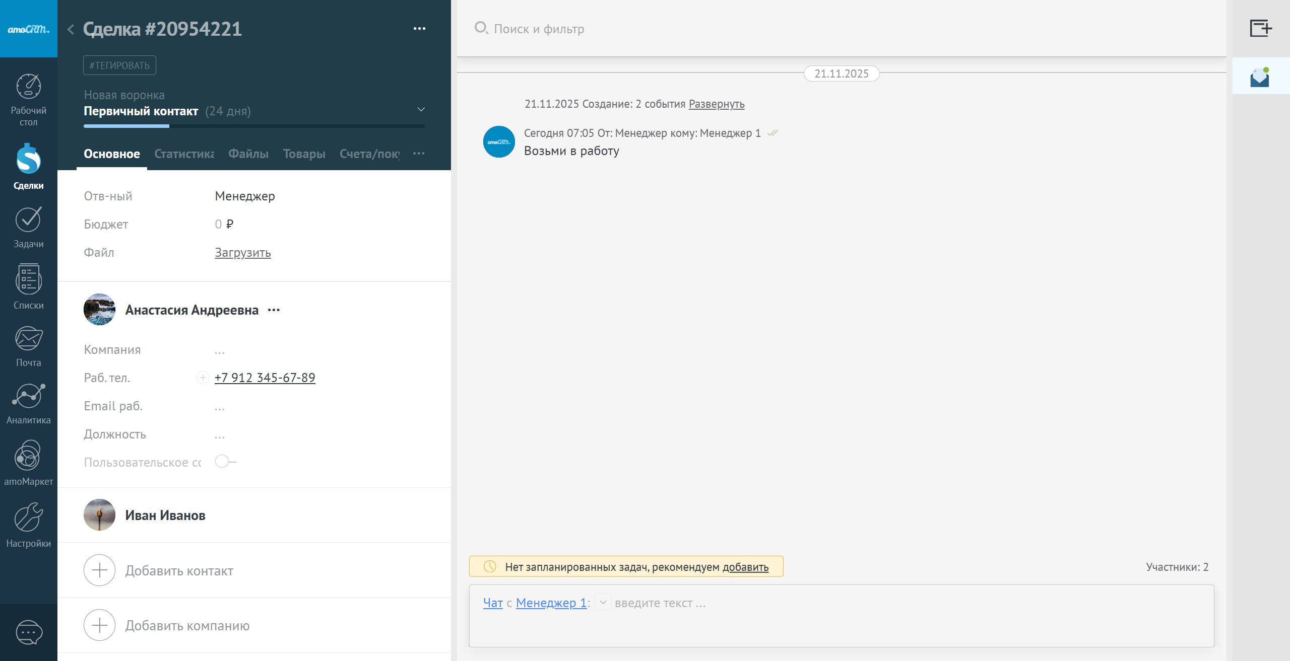 В amoCRM в рамках карточки сделки или покупателя, вы можете вести коммуникацию как с пользователями вашего аккаунта, так и с клиентами с помощью внешних сервисов.
