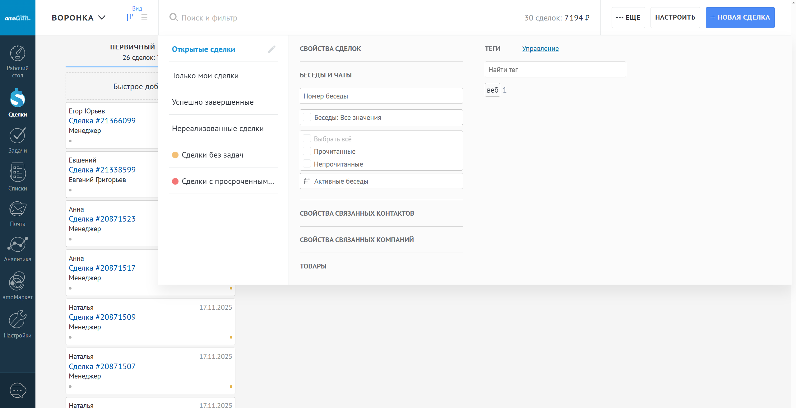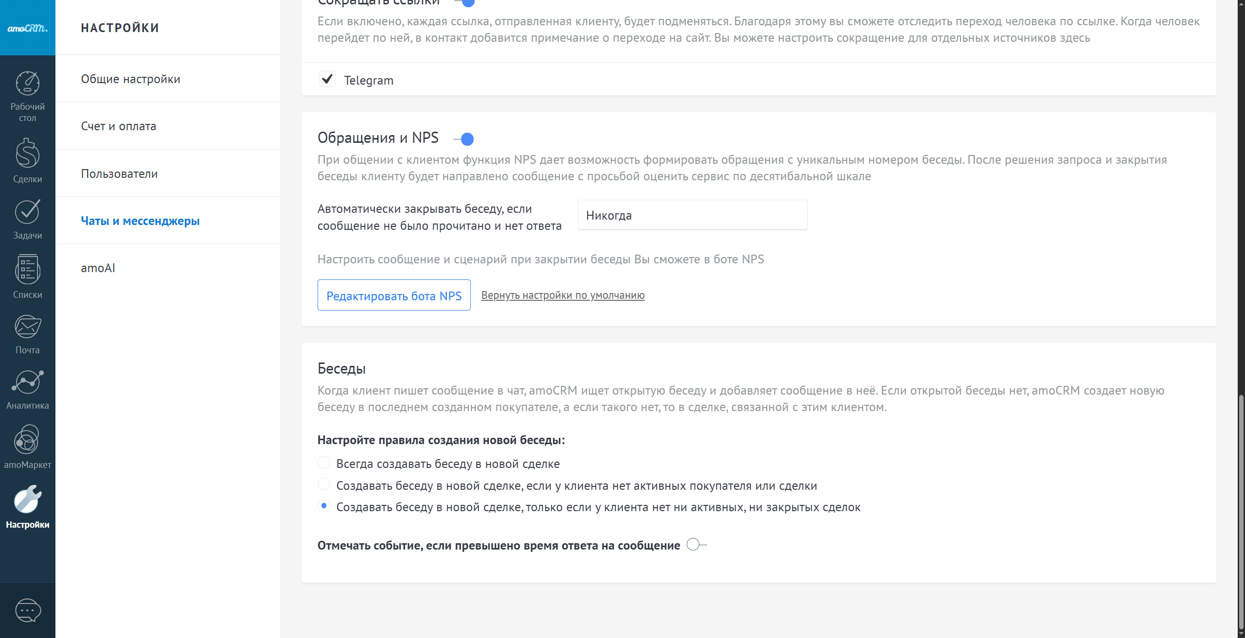 Также в разделе "Настройки" - "Чаты и мессенджеры" можно настроить правила создания новой беседы или включить создание события "превышено время на ответ", если время ответа больше, чем настроенное вами. Если у контакта нет ни одной сделки или покупателя в аккаунте - новая беседа всегда создаст новую сделку.