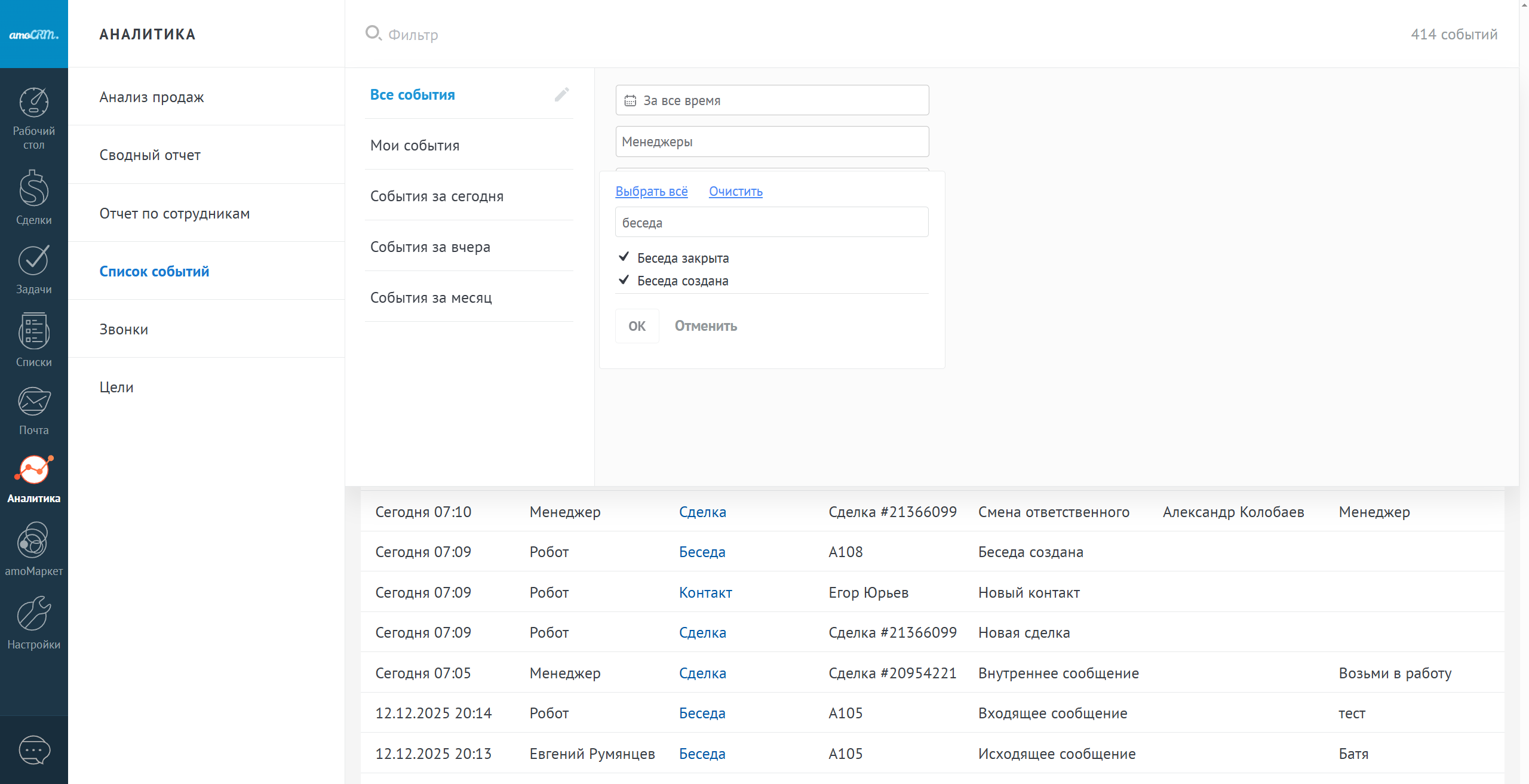 Также в разделе: аналитика-список событий есть фильтрация по событиям: беседа создана и беседа закрыта. Применив фильтр по данным событиям, вы увидите все события о создании и закрытии бесед, а также автора данных действий.