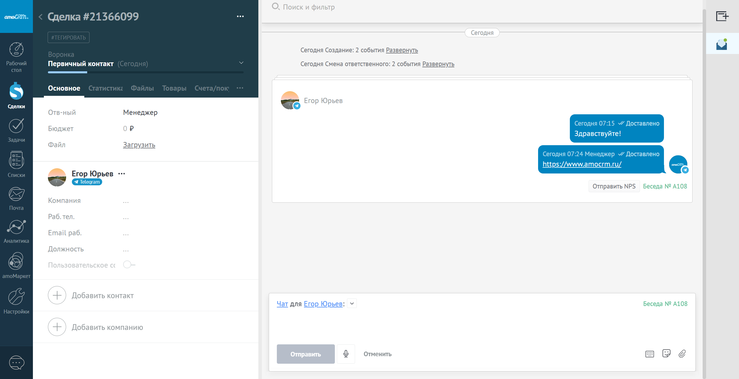 Важно, что создание беседы исходящим сообщением системно не создаст сделки, данное правило распространяется только на беседы, созданные входящим сообщением.