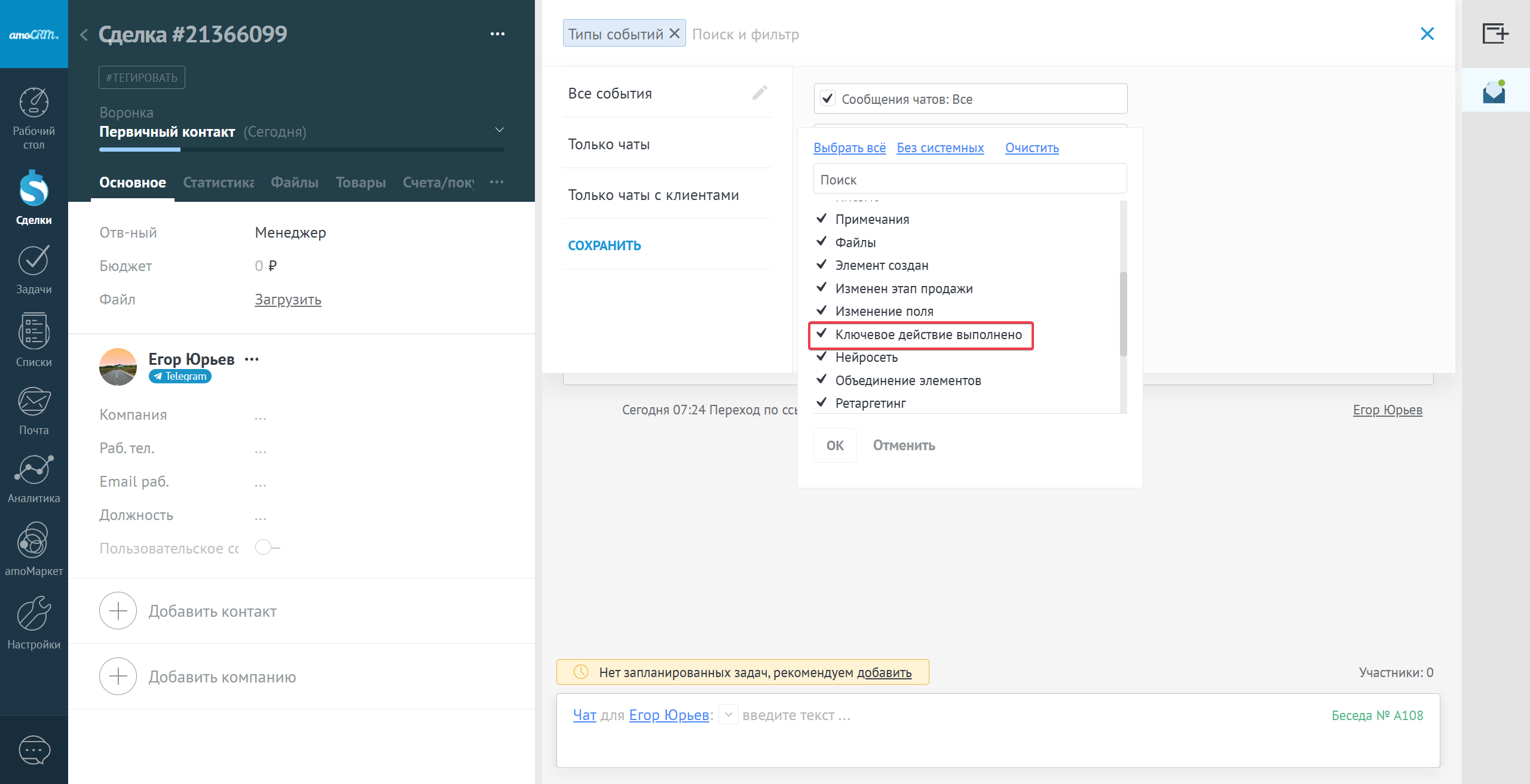 Внимание: это событие типа "Ключевое действие выполнено" которое по умолчанию выключено в фильтре, чтобы событие отобразилось - нужно включить его в фильтре событий в карточке.