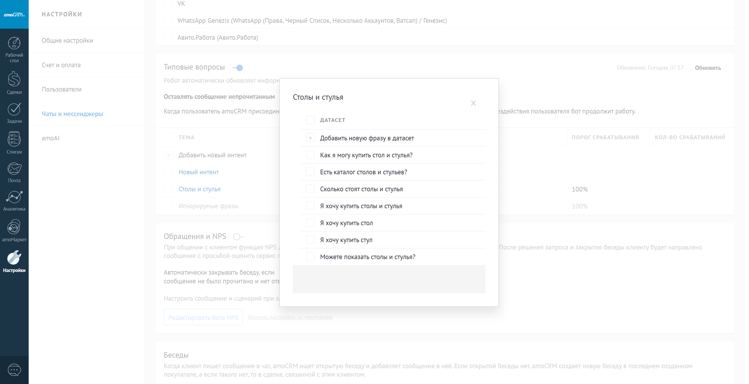 Типовые вопросы (нейросеть) помогают оперативно отвечать клиентам на часто задаваемые вопросы из сообщений в мессенджерах.
