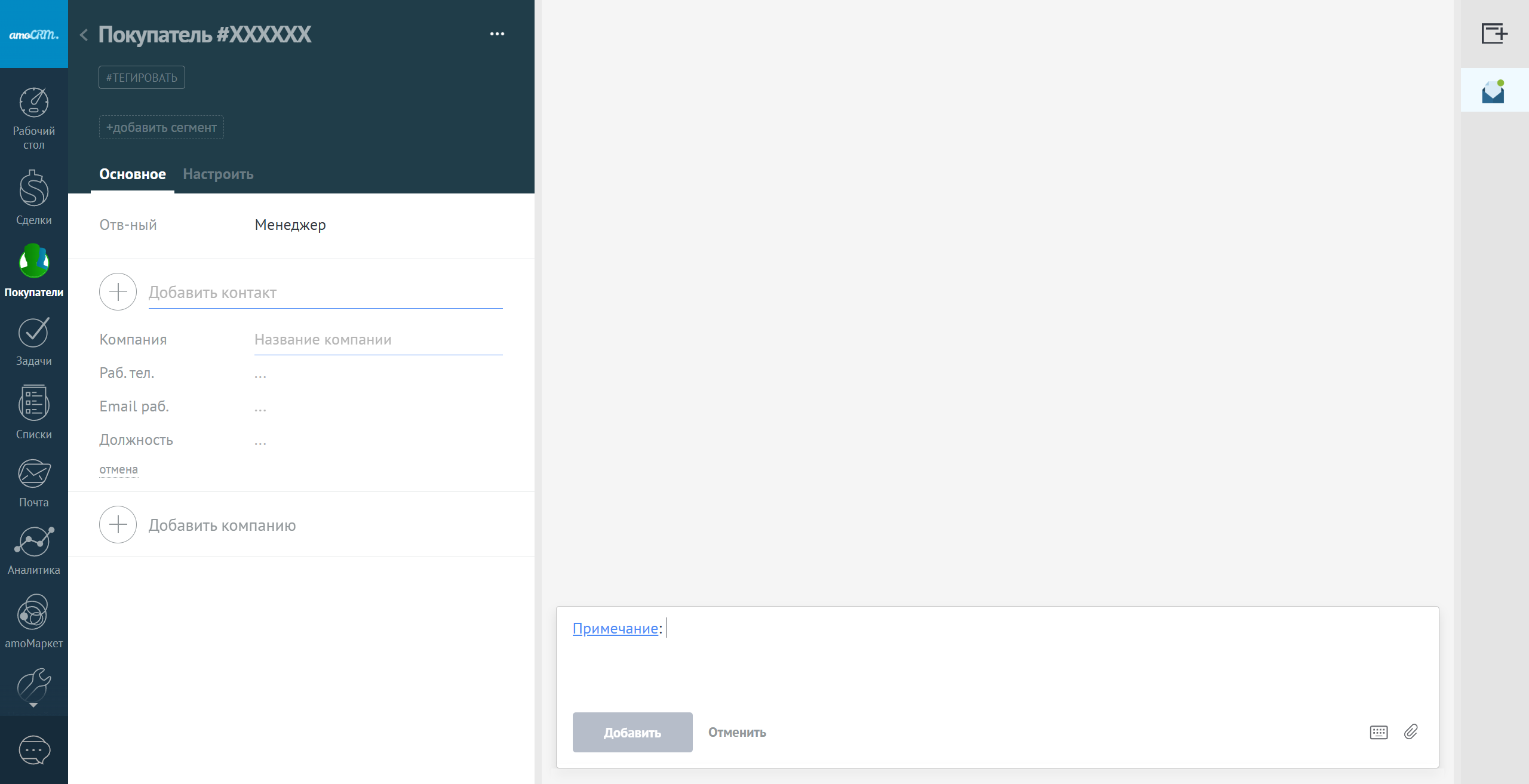 Создание покупателя подобно созданию сделки. Вам необходимо в правом верхнем углу раздела "Покупатели" нажать "Новый покупатель", у Вас откроется новая карточка: