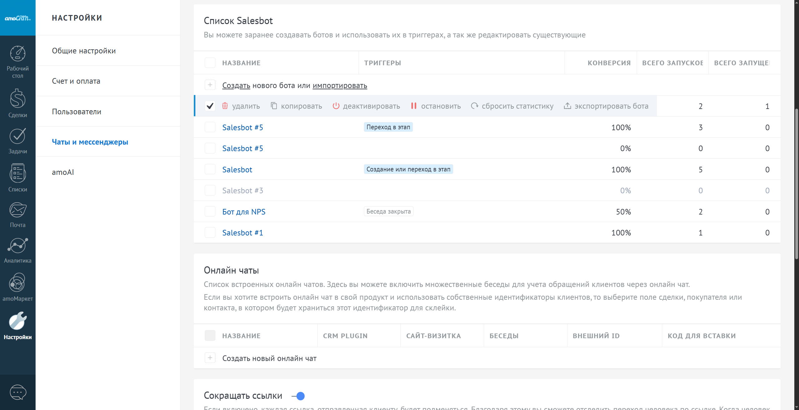 Ранее созданного Salesbot`a вы можете экспортировать/импортировать, активировать/деактивировать, остановить и копировать в разделе Настройки - Чаты и мессенджеры. Так же возможно удалить ботов в данном разделе, в том числе и массово отметив несколько ботов.