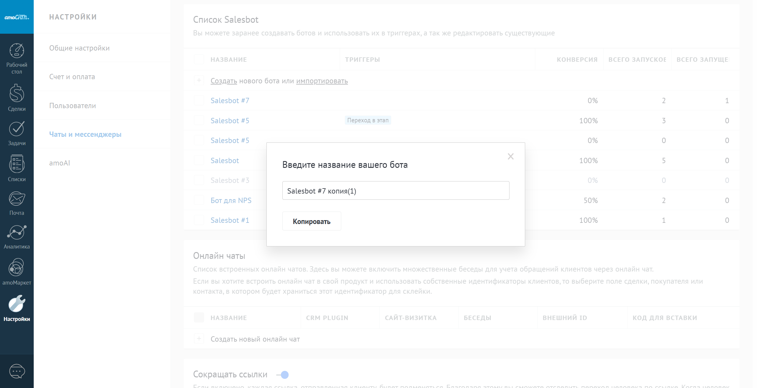 Копирование Salesbot доступно в разделе “Настройки” - “Чаты и мессенджеры”, а также в визуальном редакторе. При нажатии на копирование откроется окно с выбором названия копии бота.