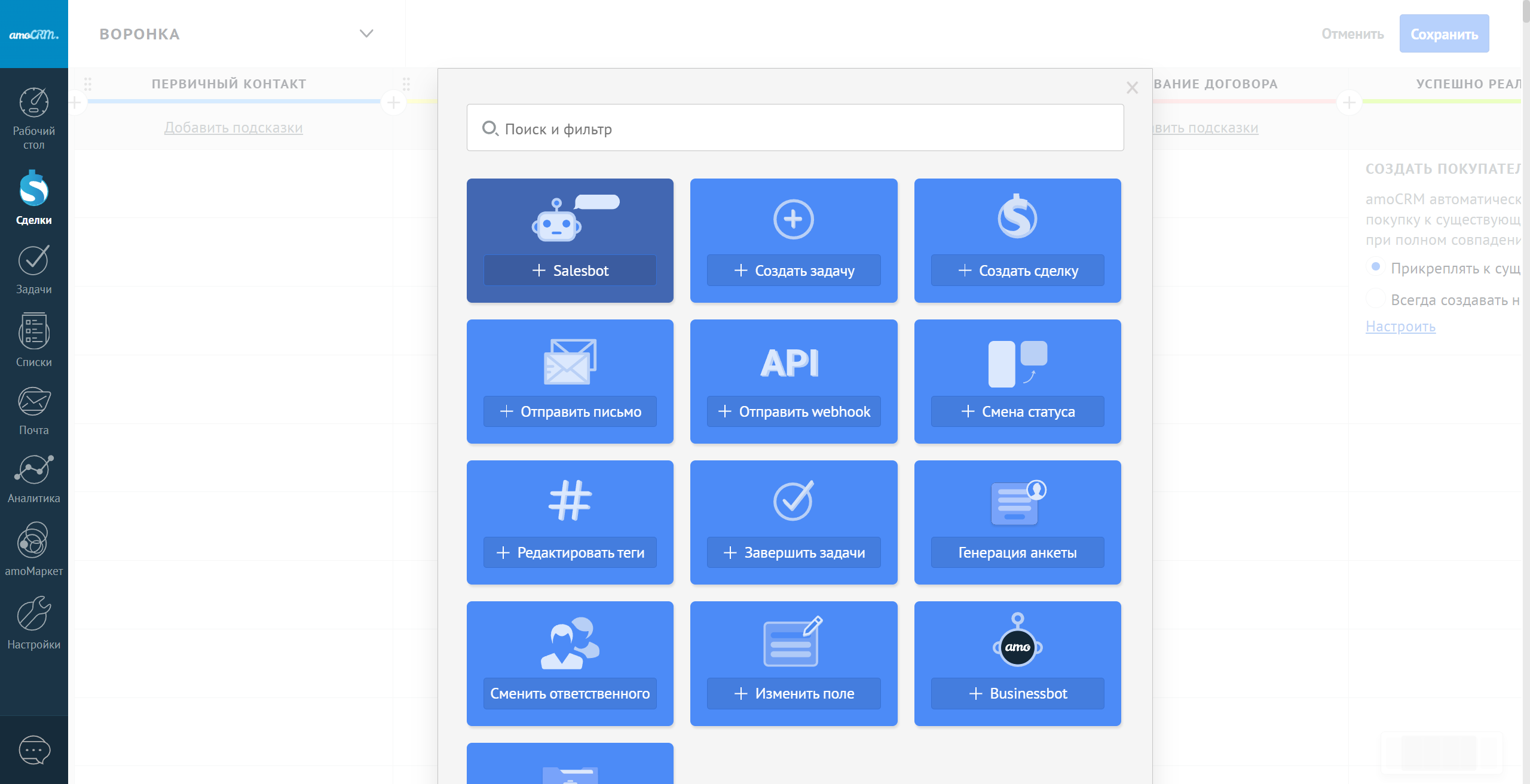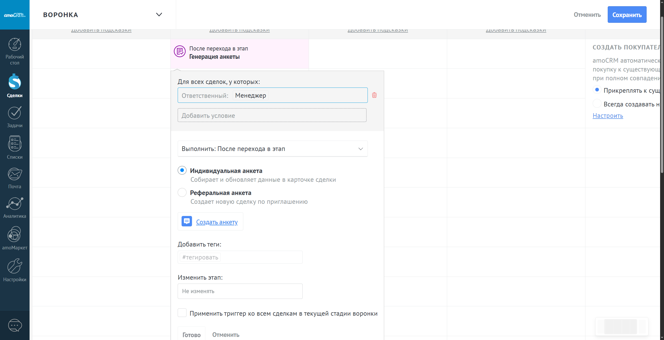Для добавления триггера "Генерация анкеты" перейдите в раздел "Сделки" или "Покупатели" - "Настроить воронку", выберите этап, на котором вы хотите создавать анкету, нажмите на него и выберите "Генерация анкеты" среди инструментов amoCRM.