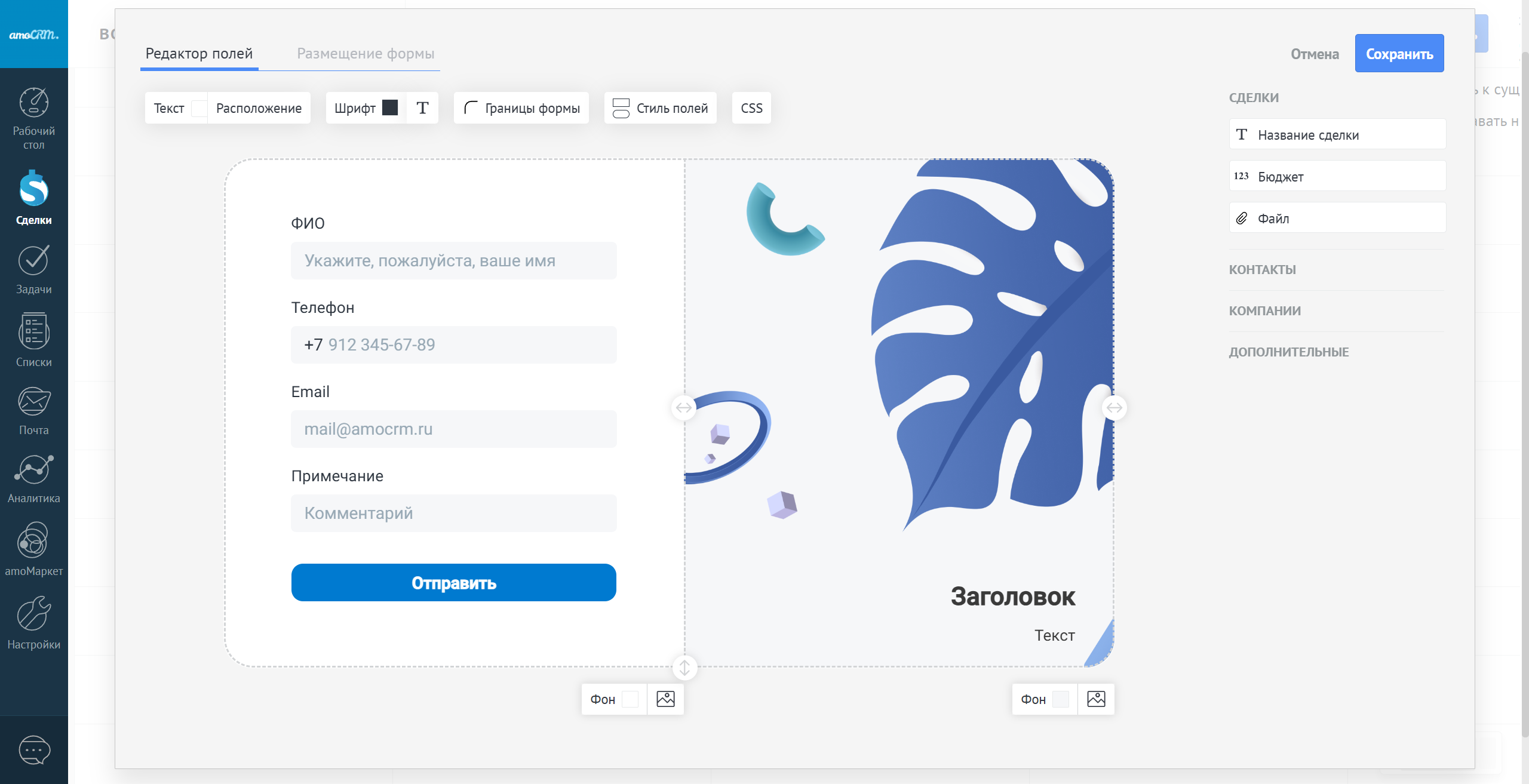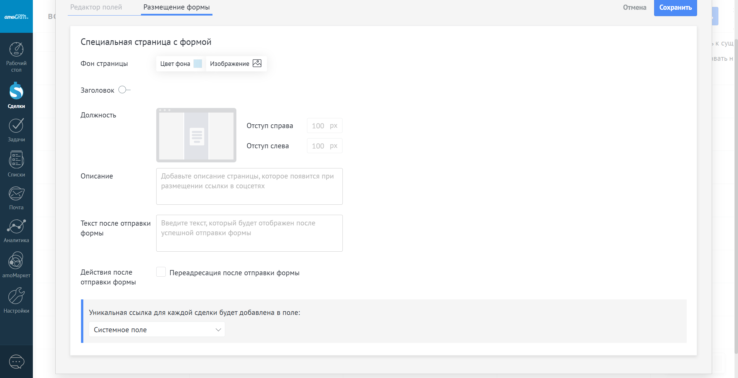 После редактирования формы можно настроить, в какое поле карточки сделки попадет индивидуально сгенерированная ссылка на анкету, по умолчанию есть системное поле, будут доступны для выбора так же поля типа текст и текстовая область;