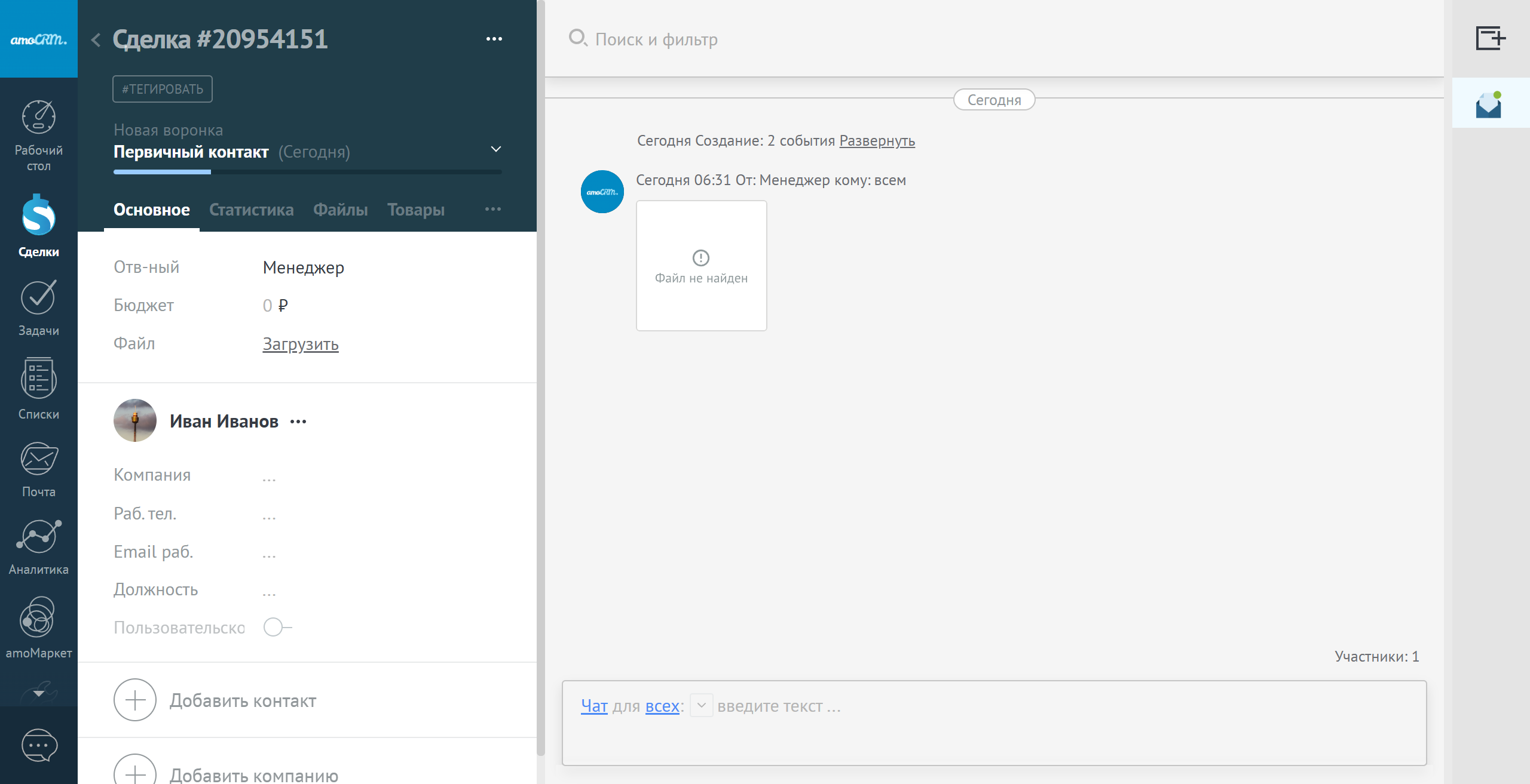 При этом файл, добавленный в примечание можно удалить нажав на крестик. Файл в сообщении чата удалить нет возможности, но можно удалить его в разделе "Списки" - "Файлы", после этого в сообщении он будет отображаться как Файл не найден