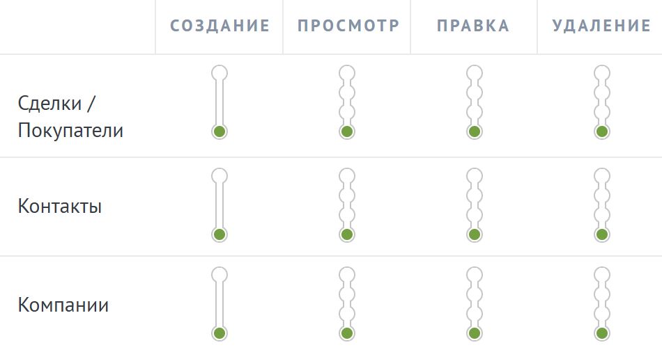 Функционал поиска дублей и объединения сделок доступен только для пользователей, у которых как минимум есть следующие права: полные права (зеленые) просмотра, редактирования и удаления всех сущностей(сделки/контакты/компании).