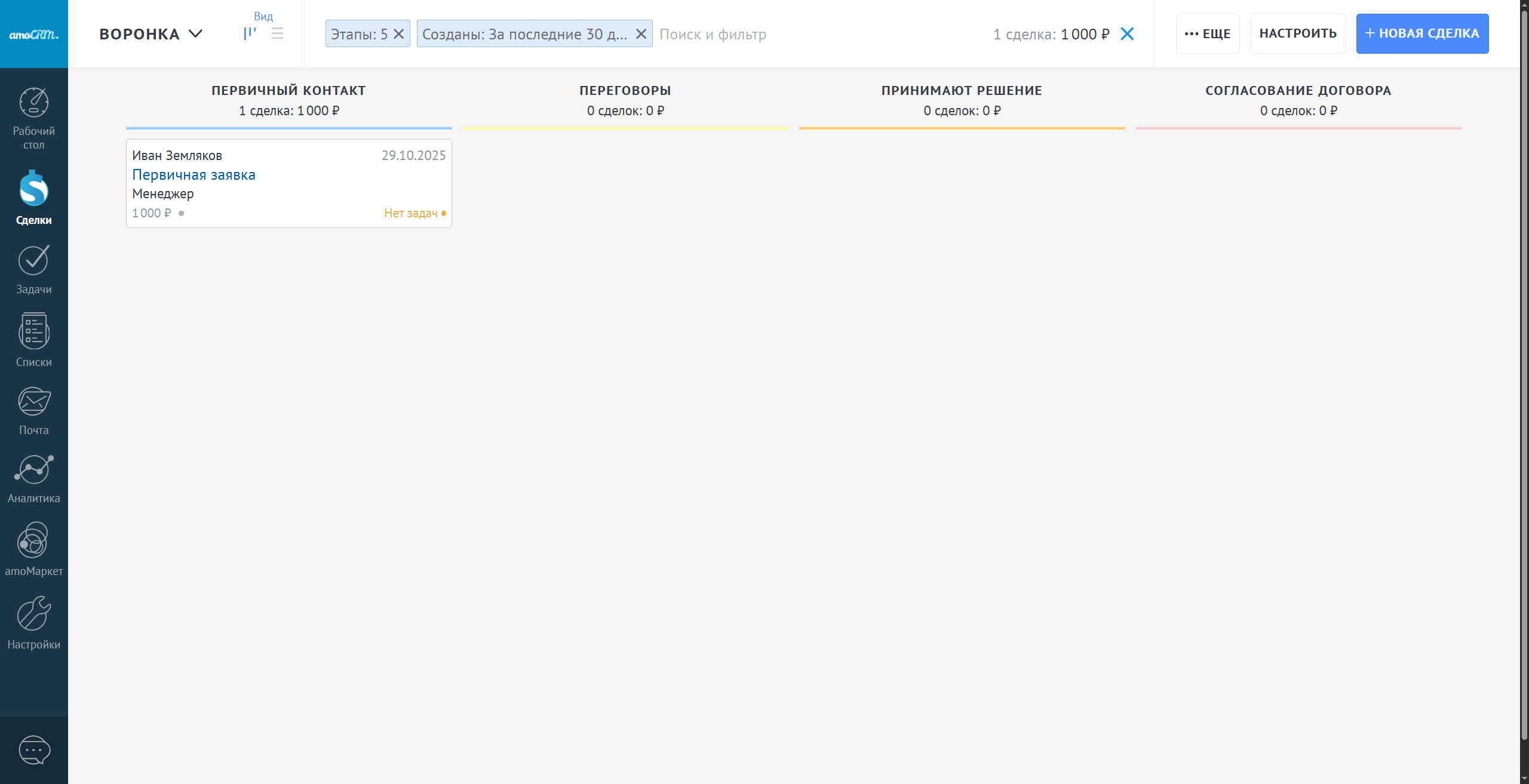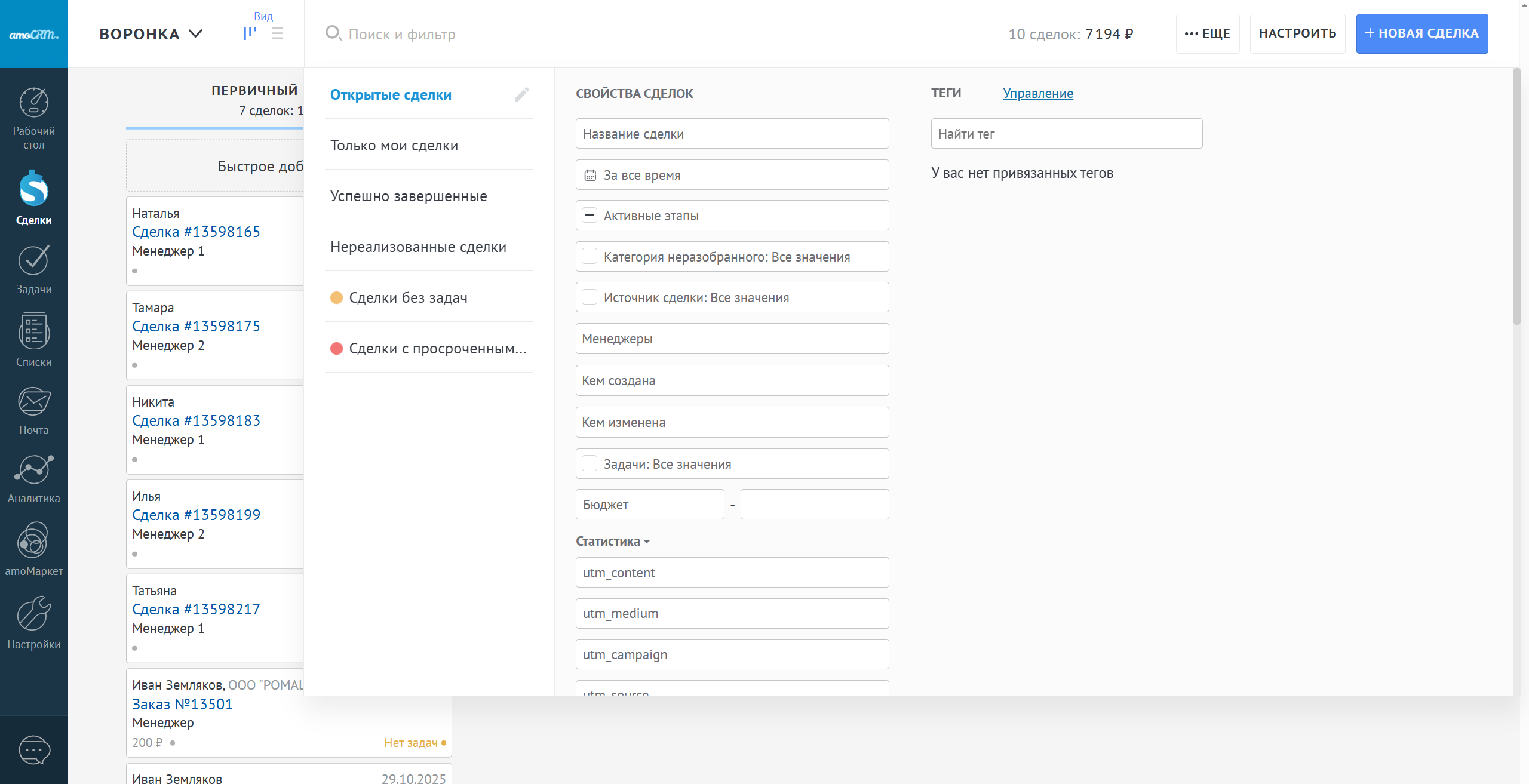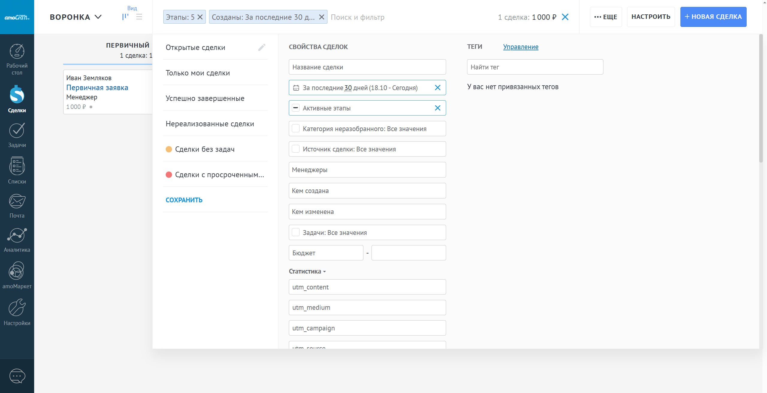 Фильтры в amoCRM являются взаимоисключающими. В случае указания 2 и более фильтров поиска в результатах поиска будут отображаться сделки, которые соответствуют всем параметрам поиска.