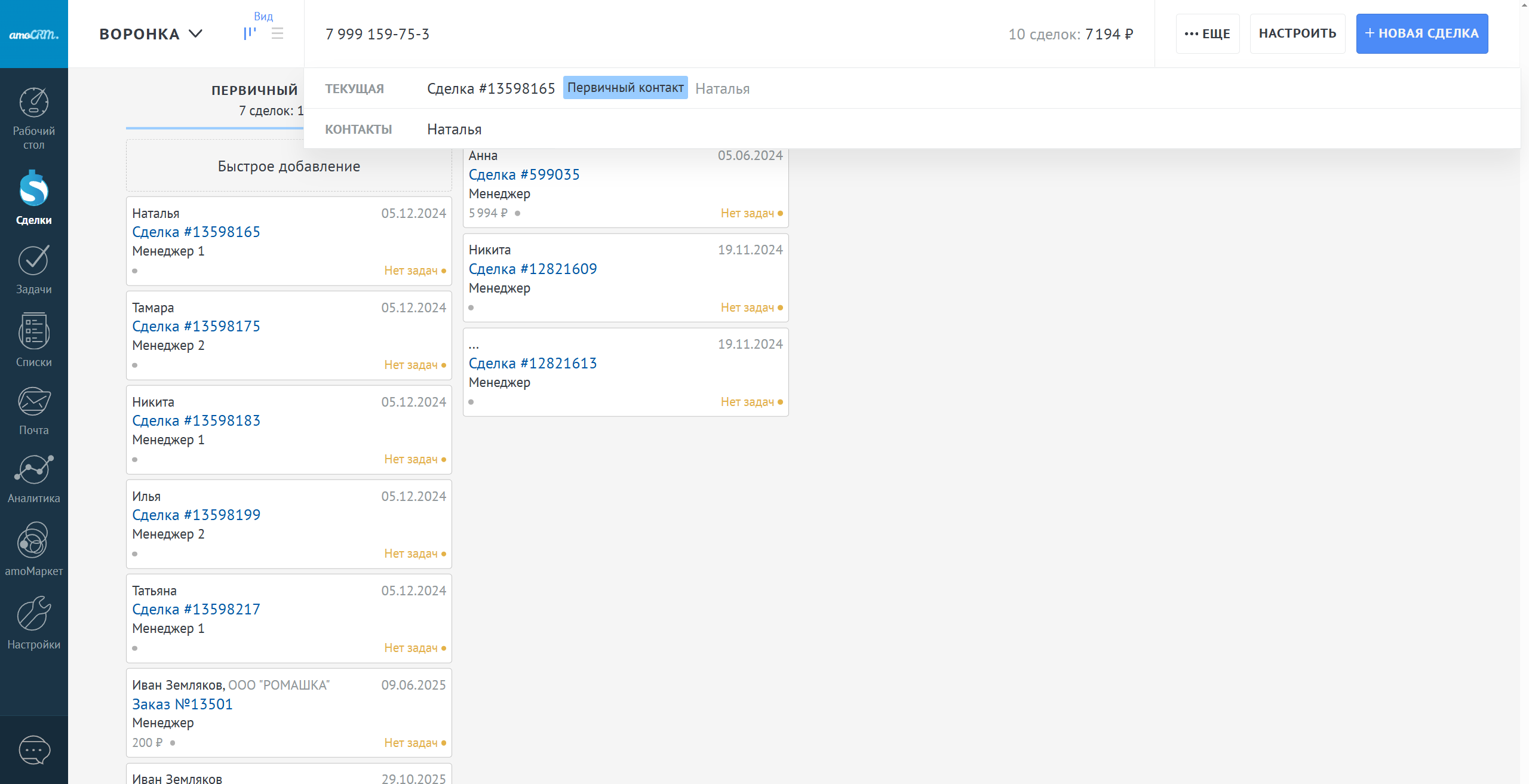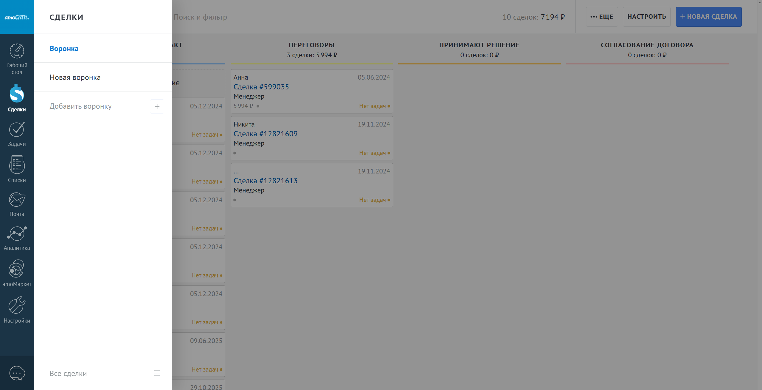 Чтобы выбрать другую воронку или режим "Все сделки" где отображаются сделки всех воронок, нажмите слева сверху на название текущей воронки и выберите нужную для перехода.