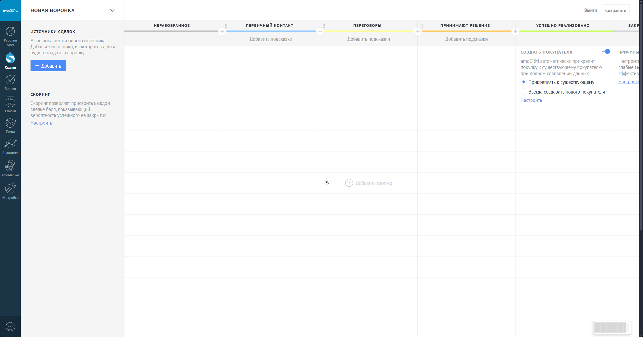 Давайте перейдем в раздел Сделки и кликнем на кнопку "Настроить" в правом верхнем углу. Мы перешли в раздел "Настройки" воронки. Справа вы видите воронку, а слева источники.