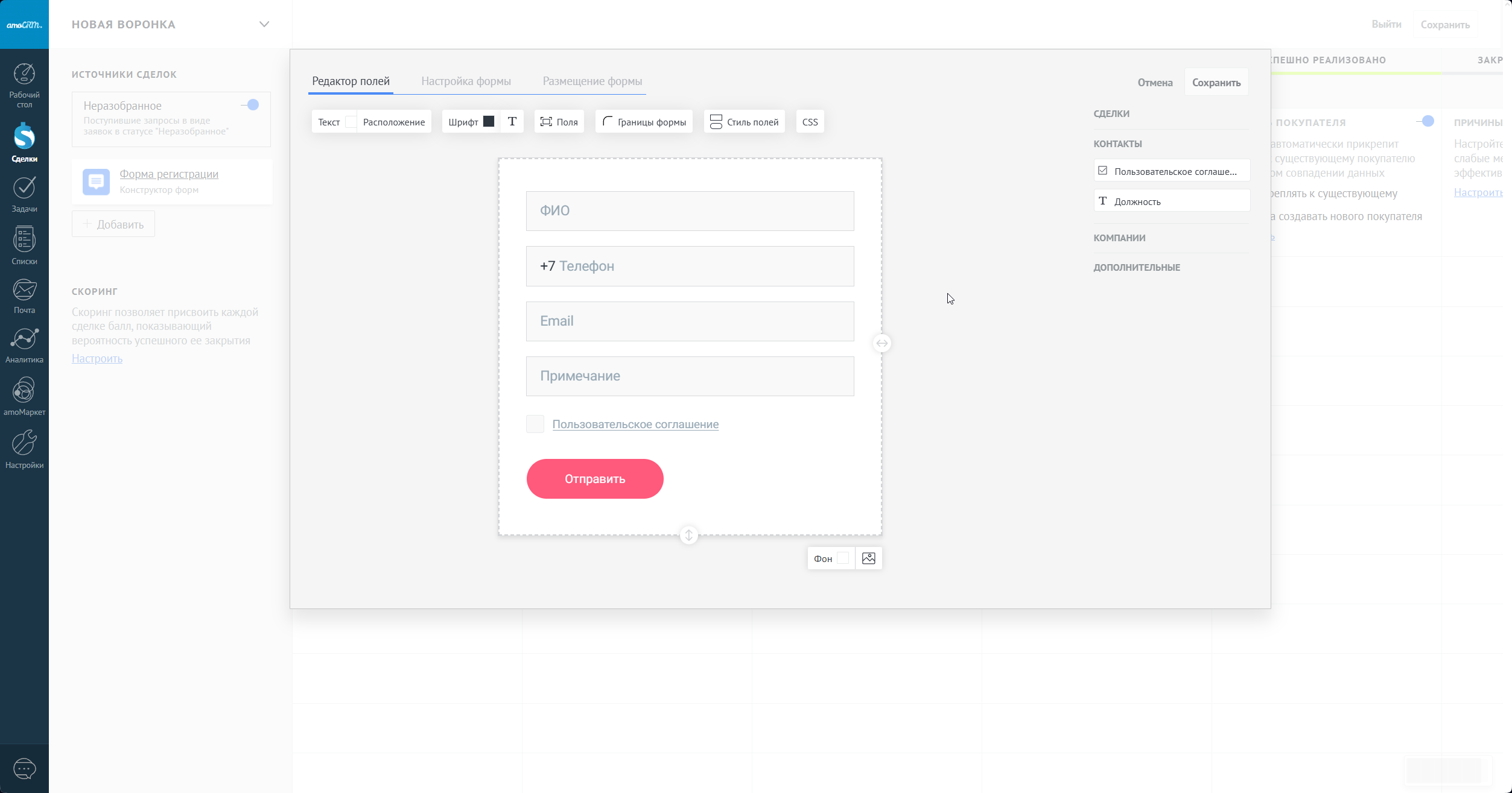 При желании вы можете настроить форму так, чтобы из нее создавалась сделка на определенном этапе. Для этого необходимо указать в форме нужный вам этап.