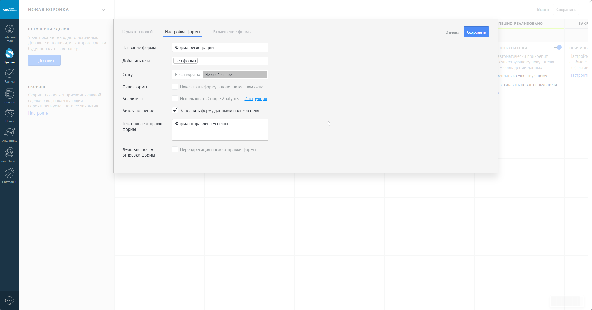 Перейдем к следующему разделу - настройка формы. Здесь вы можете поменять название, добавить тег, выбрать воронку и статус, на который будет приходить заявка. Вы также можете настроить, как показывать форму и настроить использование Google Analytics. Давайте поменяем название формы на "Форма регистрации" и присвоим тег "веб-форма" всем сделкам, которые будут созданы после заполнения данной формы.