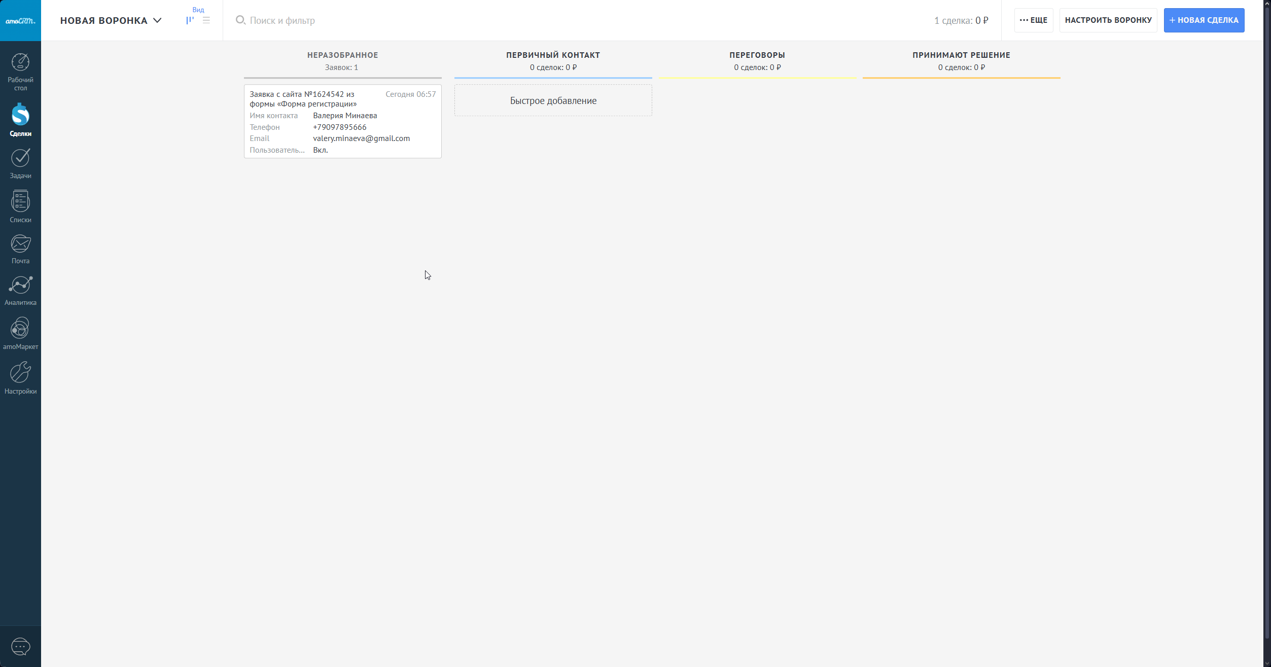 Представим, что мы клиент и заполняем форму. Возвращаемся в аккаунт amoCRM, переходим в раздел "Сделки". Здесь мы видим нашу первую заявку из формы. Мы можем создать из нее сделку, одним кликом, просто наведите курс на заявку и кликните принять или просто перетащите ее в нужный столбец.
