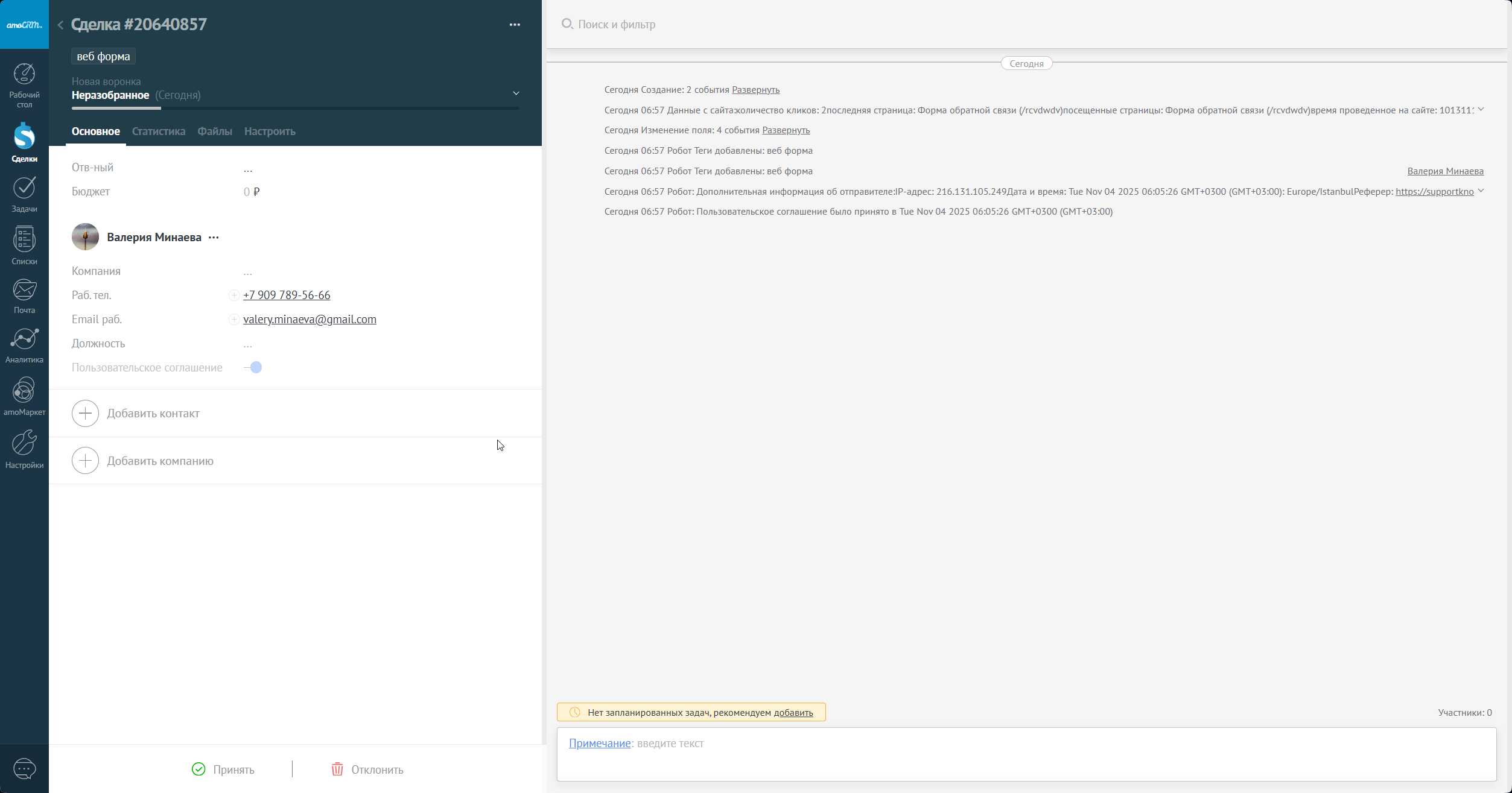 Теперь перейдем в сделку, и вся информация уже в карточке, контактные данные: телефон, почта, имя вашего клиента. Название сделки сгенерировано автоматически, при необходимости вы можете поменять его.