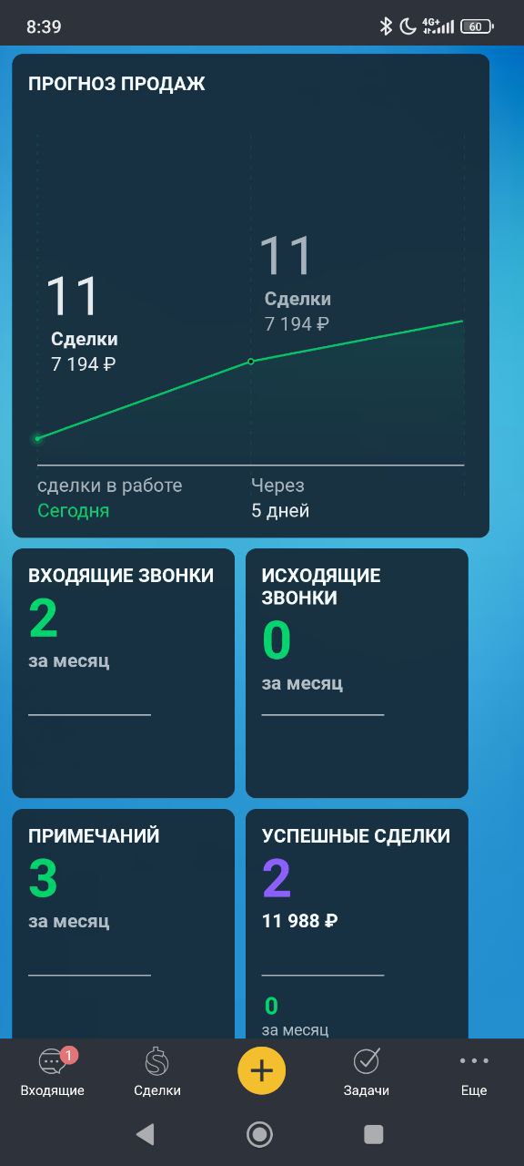 В мобильном приложении также как и в web-версии вы можете: искать и просматривать сделки, контакты и компании, добавлять примечания и работать с задачами, также вы просматривать аналитику на рабочем столе.