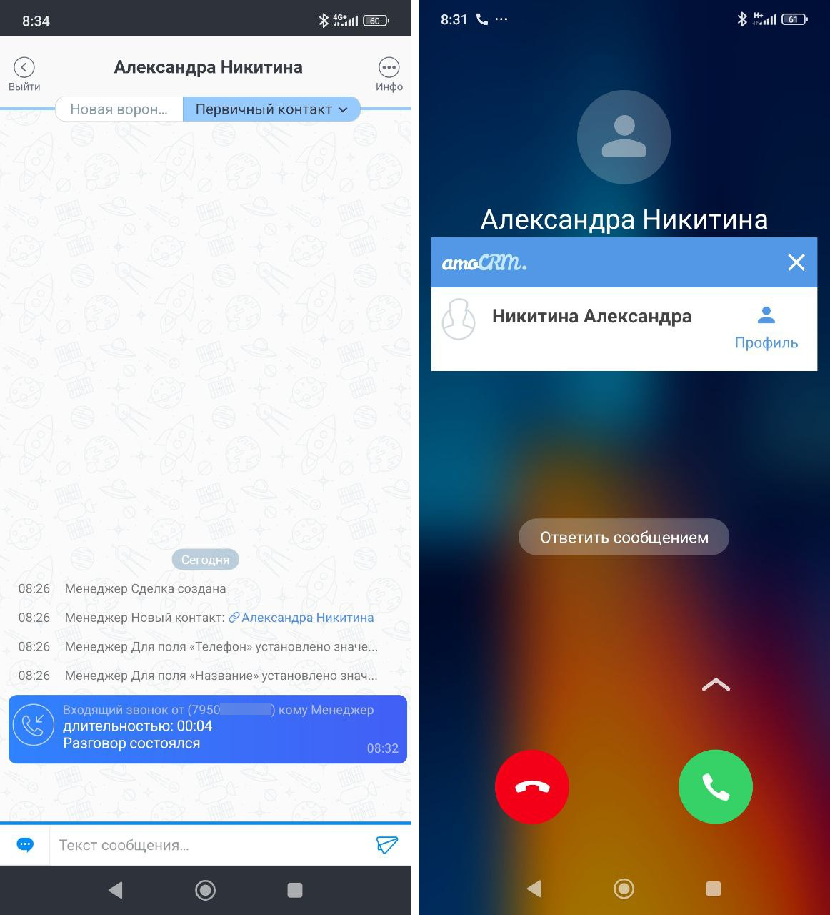 Теперь, когда вам позвонит клиент, чей номер есть в amoCRM, но нет в телефонной книге, он определится на экране вашего мобильного телефона.