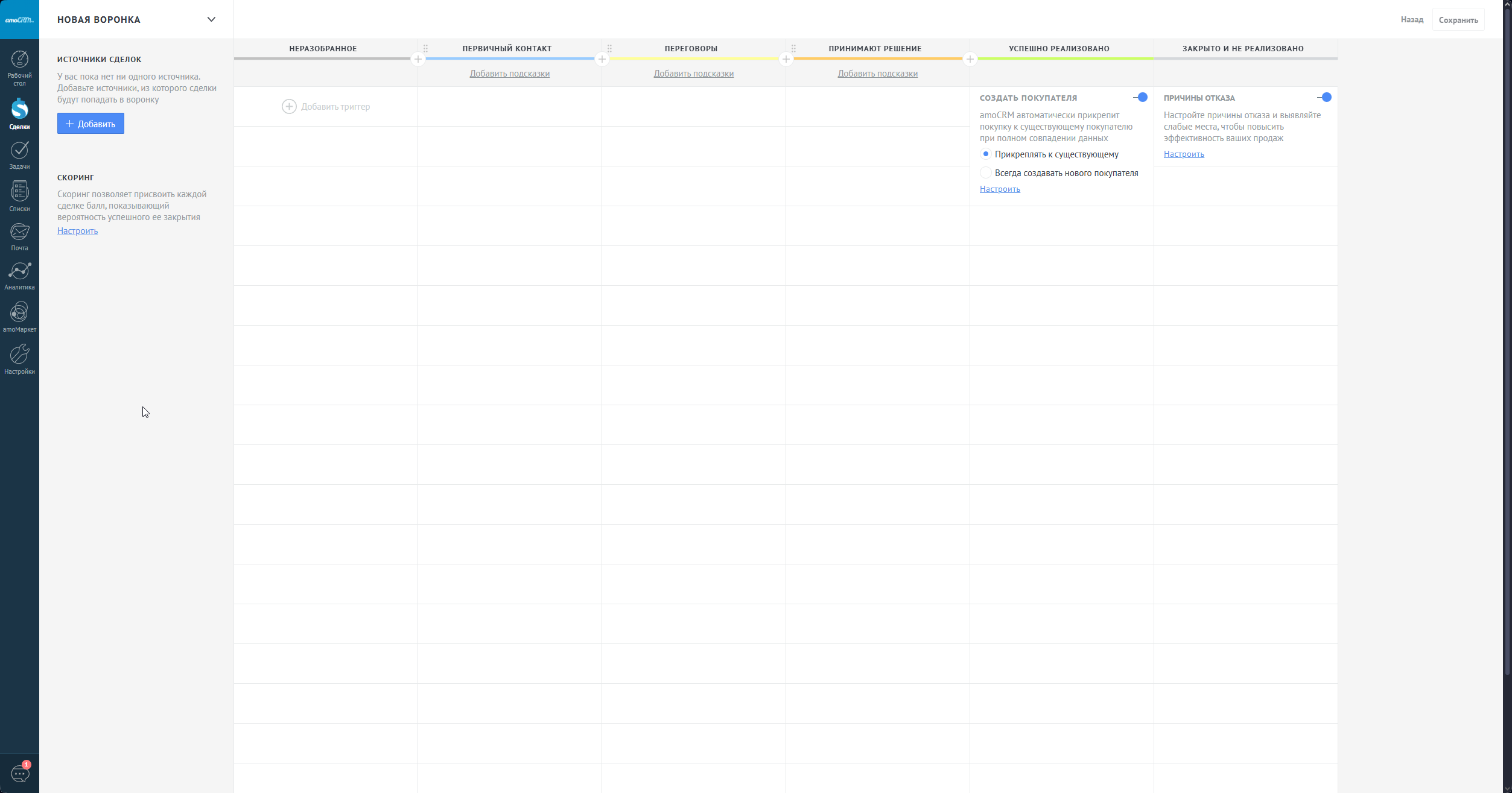 При создании аккаунта в amoCRM автоматически создается первая стандартная воронка продаж с этапами. Ее можно полностью изменить в соответствии с потребностями вашего бизнеса.