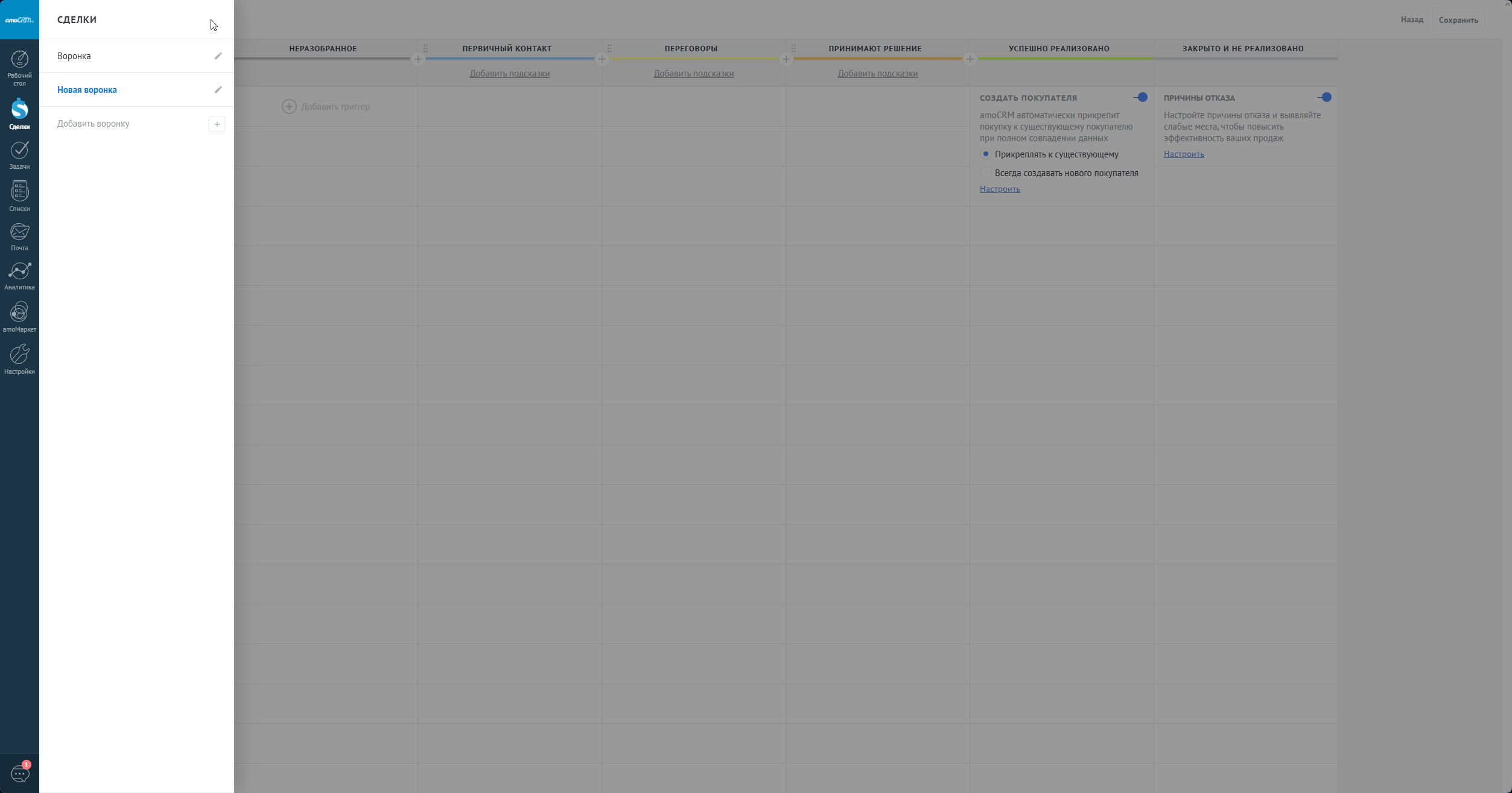 Если у вас несколько направлений, вы можете создать несколько воронок, кликнув на название воронки в левом верхнем углу, у вас откроется список воронок с возможностью добавления новых и редактированием названий существующих.