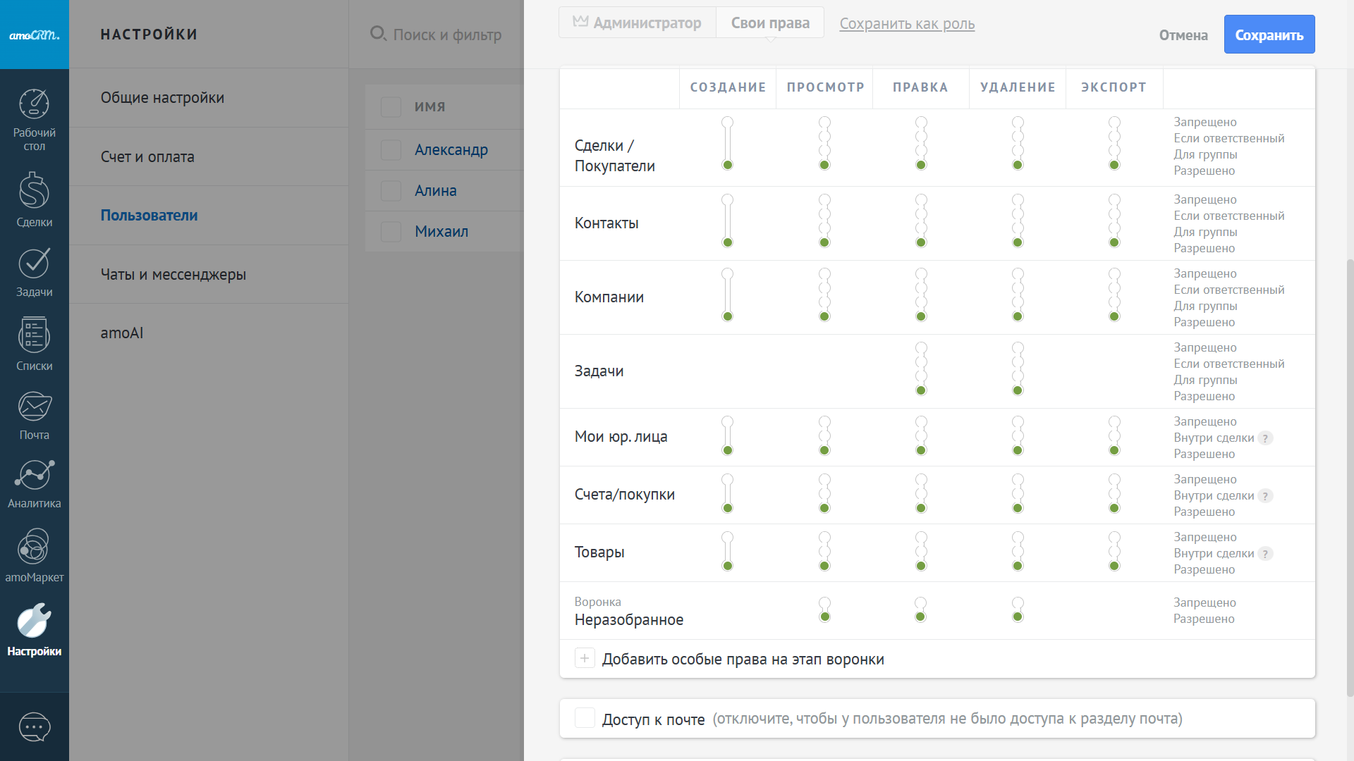 Вы также можете дать администраторский доступ, это значит что пользователь сможет добавлять других пользователей, настраивать аккаунт и подключать сторонние интеграции, доступ к почте, тогда он сможет просматривать все корпоративные ящики, даже если письма не прикреплены к карточке.