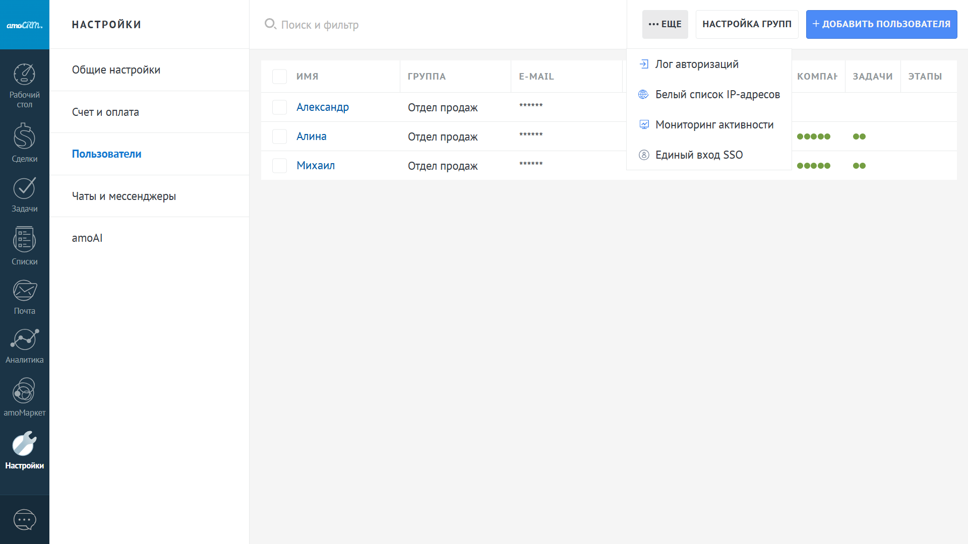 Для того, чтобы полноценно оценить возможности amoCRM, мы рекомендуем уже на первом этапе тестирования добавить нескольких менеджеров продаж в аккаунт. Таким образом, вы сможете понять, как работает разграничение прав доступа, коммуникации, аналитика и многое другое гораздо нагляднее.
