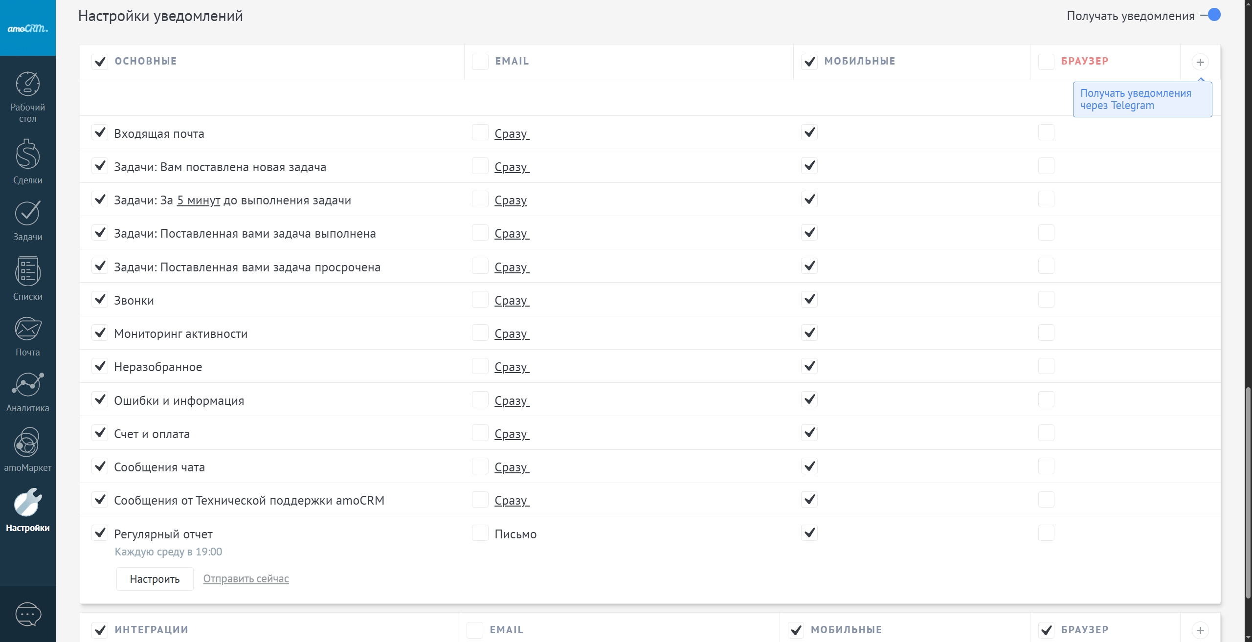 В системе предусмотрено несколько вариантов уведомлений о задачах. Уведомления можно настроить на почту, в центр нотификаций, браузер или от телеграм бота с уведомлениями.