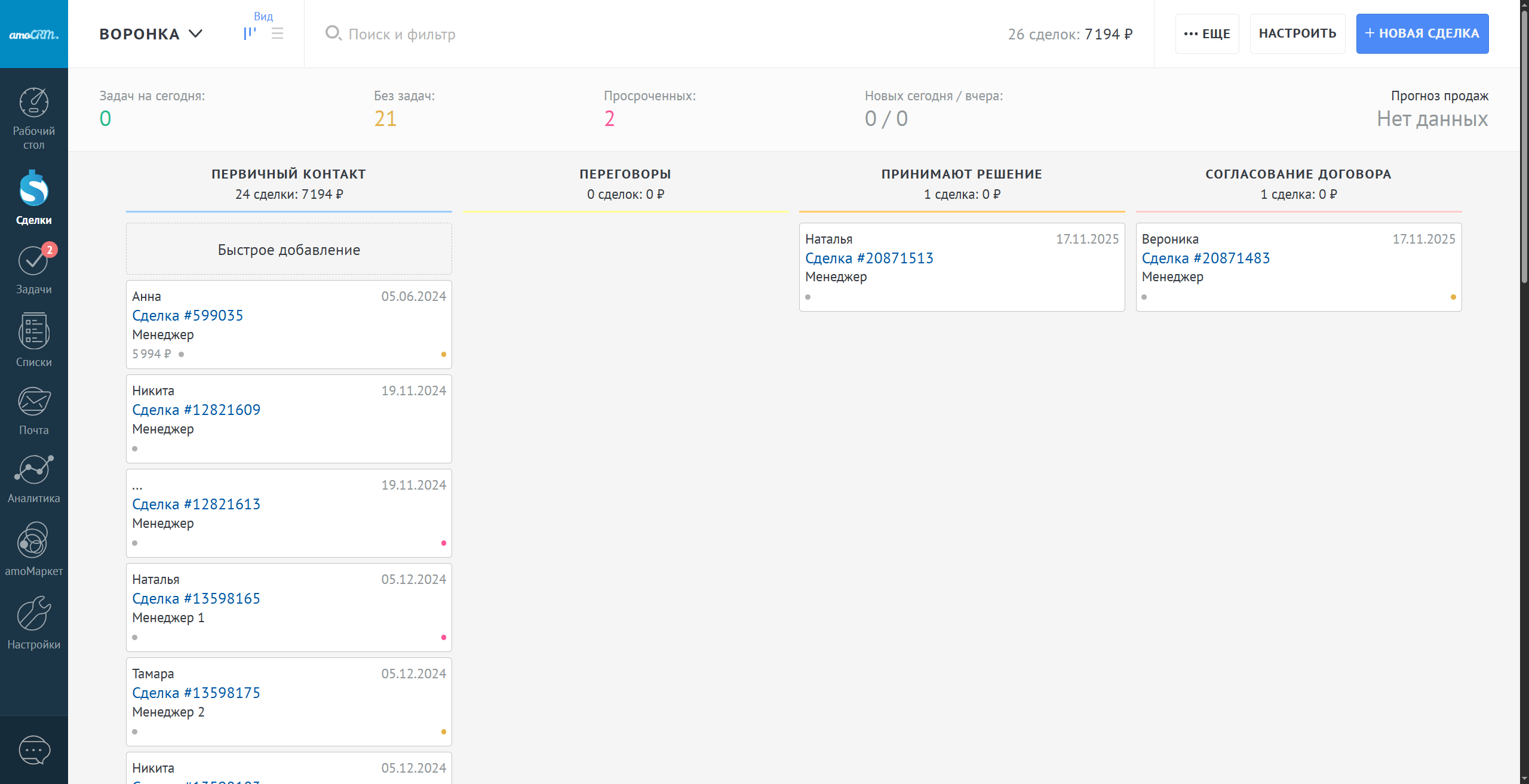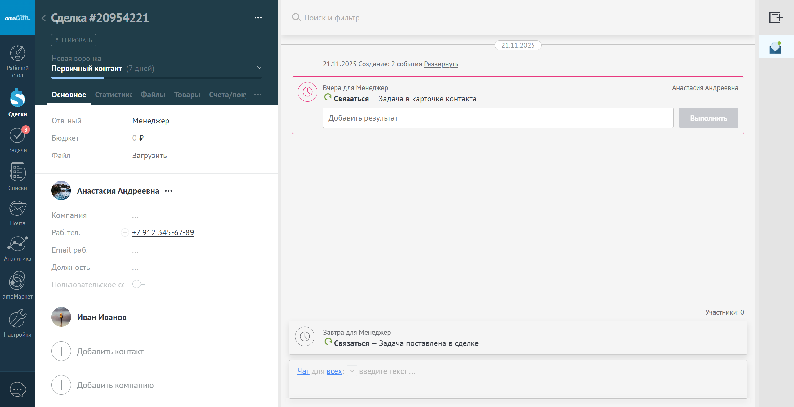 Если в разделе "Сделки" отображается, что в сделке задачи нет, но внутри сделки она есть: эта задача стоит на контакт или компанию привязанную к сделке, а не к самой сделке, поэтому не отображается. Мы рекомендуем ставить задачи в сделке, если вы планируете фильтровать сделки по параметру без задач.