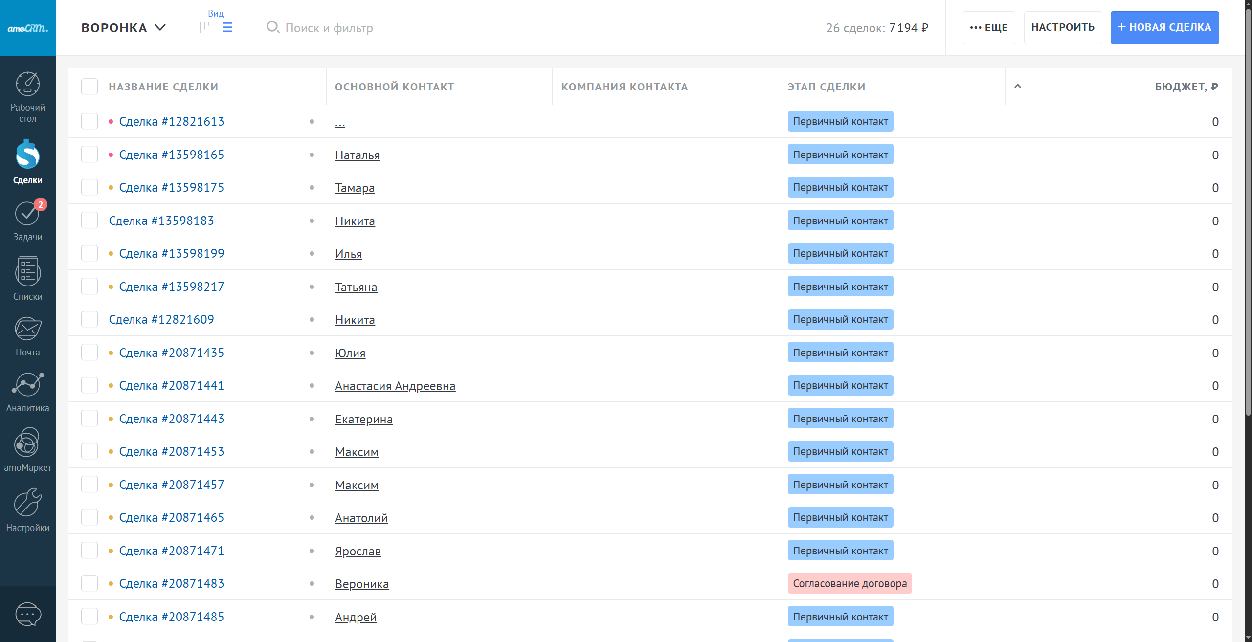 В разделе "Сделки" вы можете увидеть есть ли у сделок задачи через наличие или отсутствие у них соответствующих кружков:
