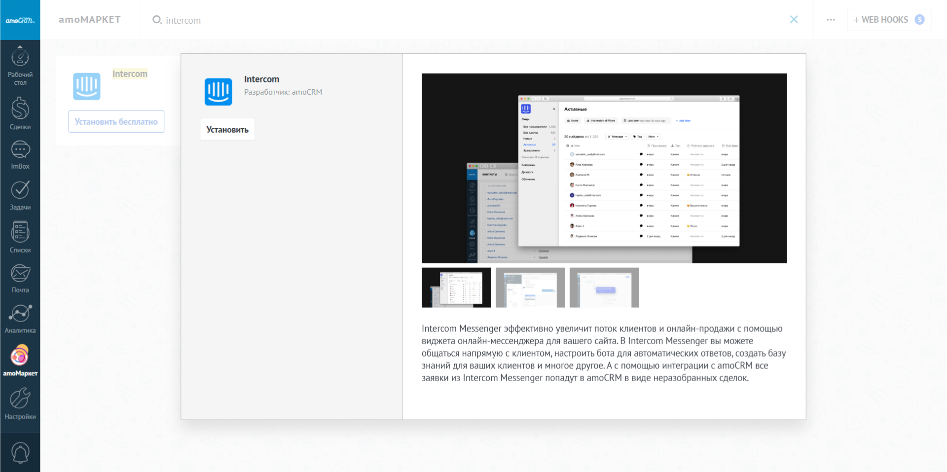 Интеграция подключена! Теперь обращения ваших клиентов в чате Intercom создадут сделки в amoCRM.