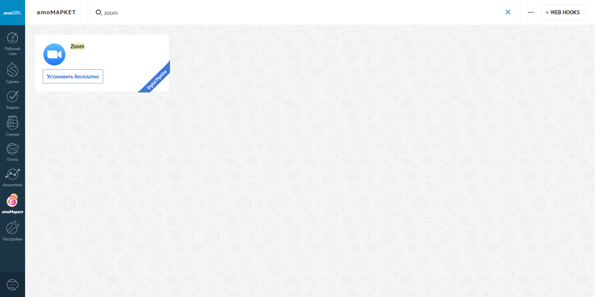 Для подключения интеграции откройте раздел amoМаркет. В поиске введите "Zoom" и нажмите "Установить".