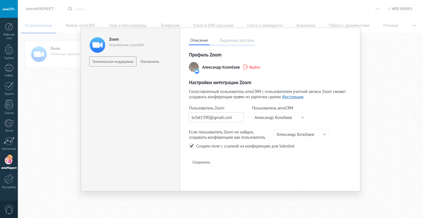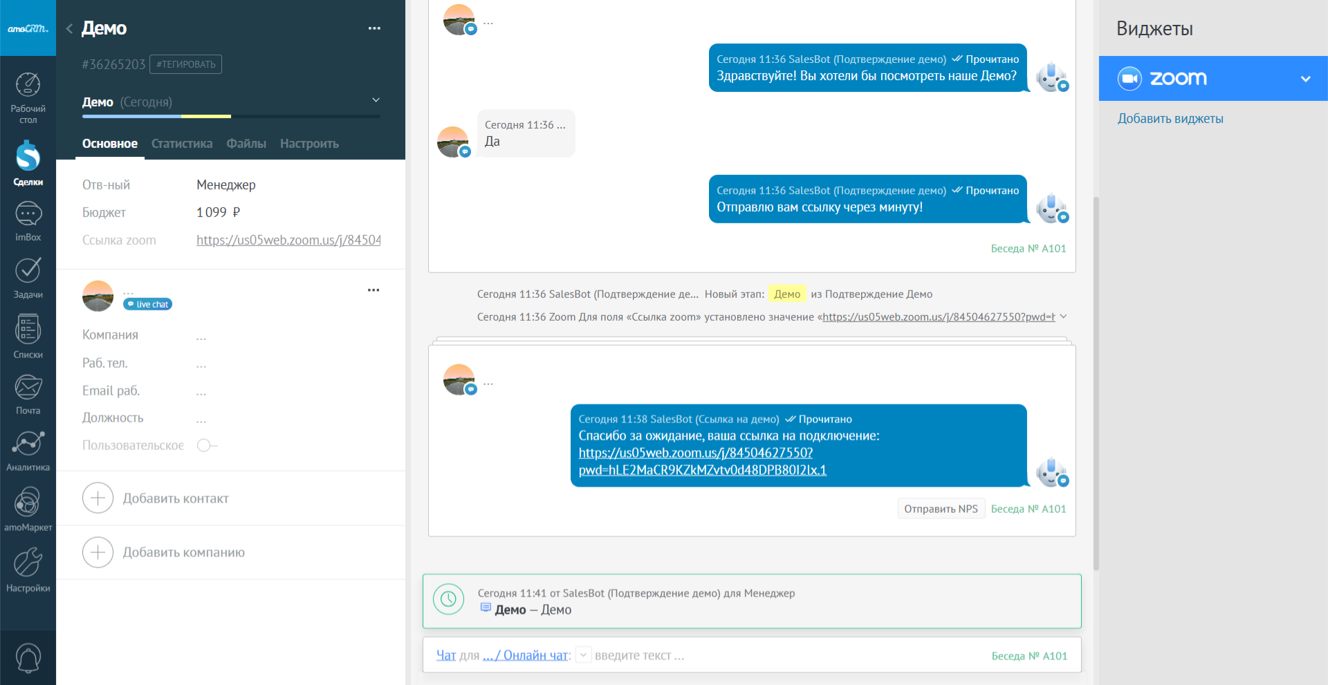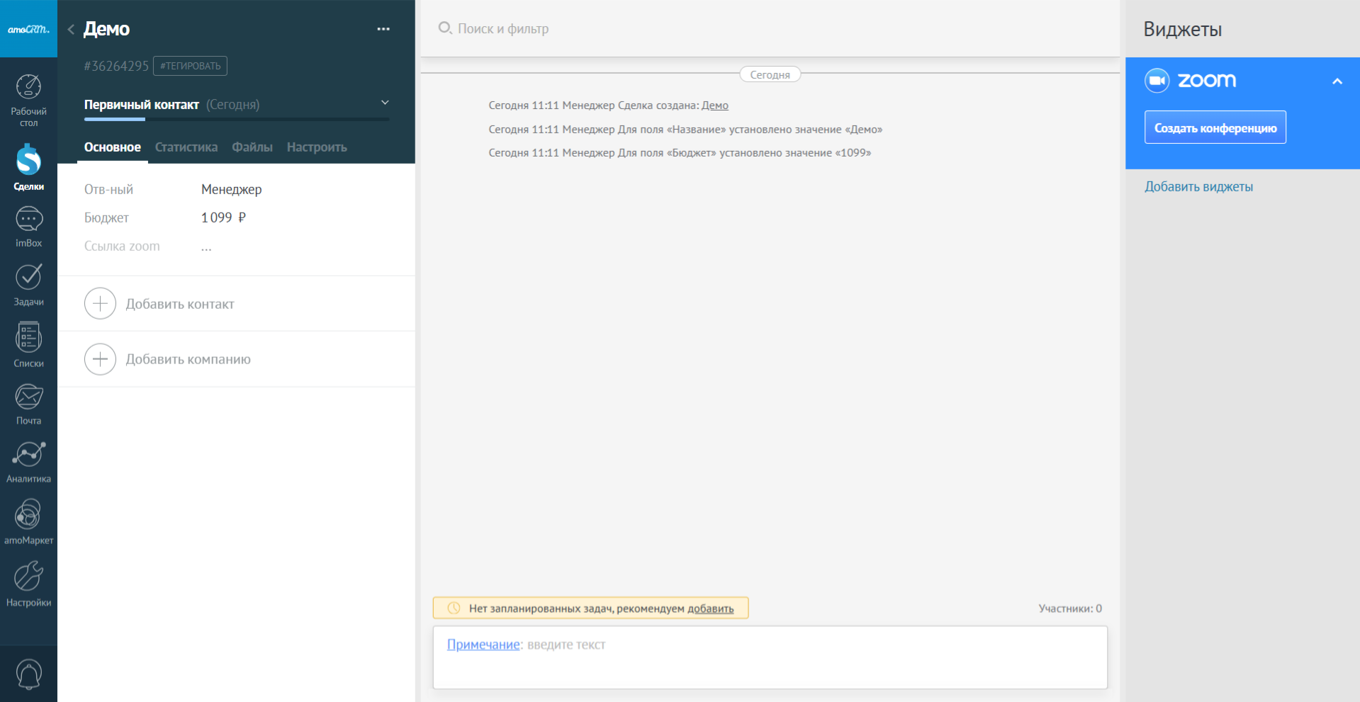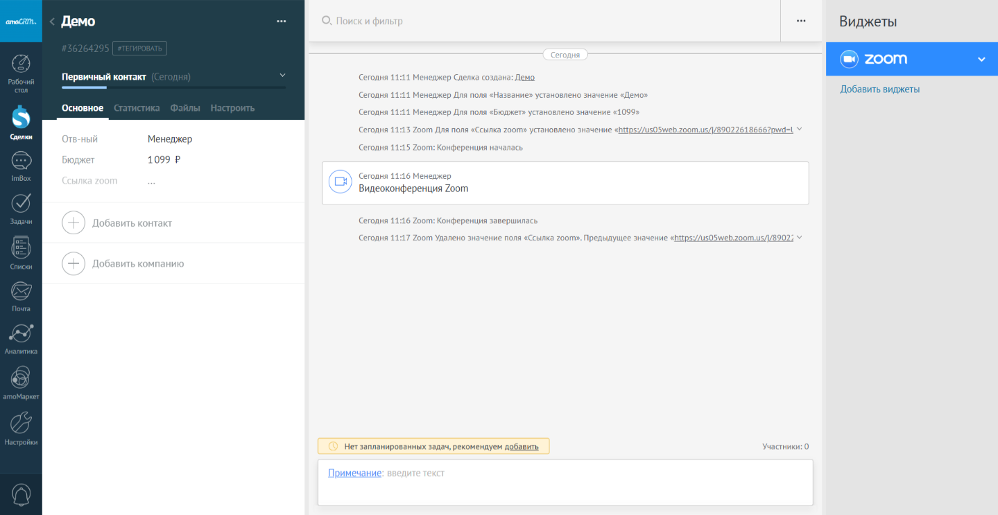 Сами конференции проходят на стороне сервиса Zoom. При окончании конференции создастся примечание в карточке Сделки.