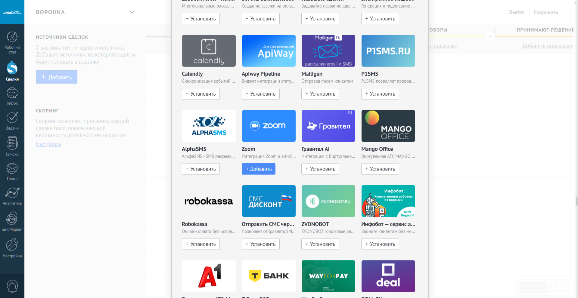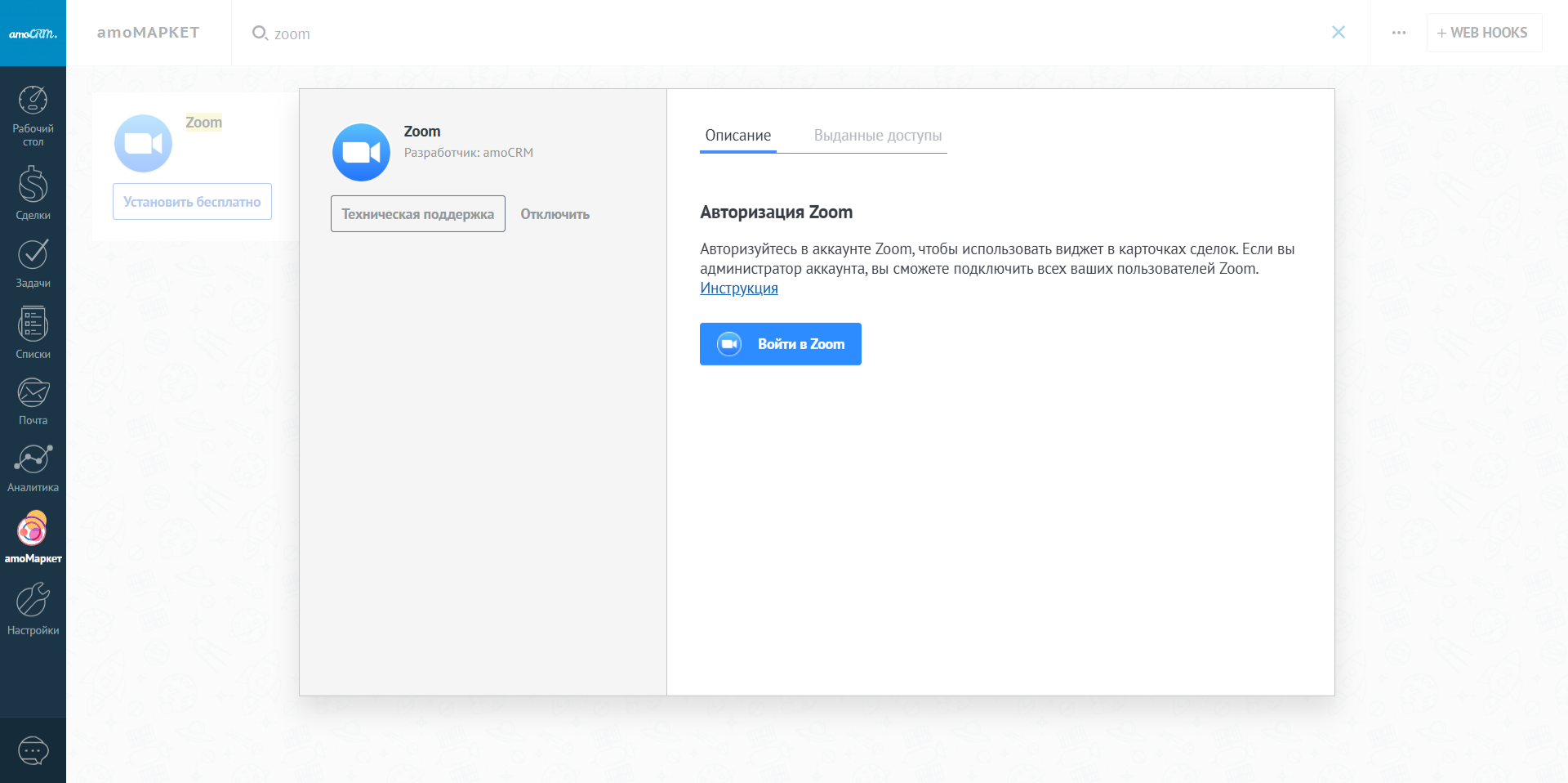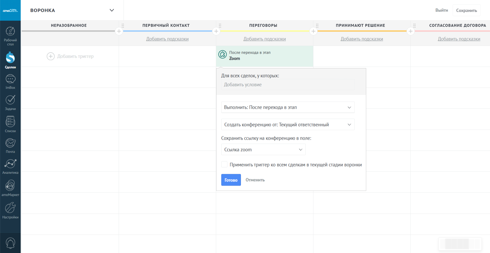 Сами конференции проходят на стороне сервиса Zoom. При окончании конференции создастся примечание в карточке Сделки.